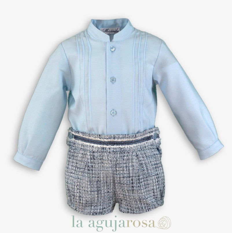 Una opción elegante y cómoda para los más pequeños. El conjunto celeste de Miranda es fresco, suave y perfecto para que los bebés luzcan arreglados sin perder la libertad de movimiento durante cualquier evento. Disponible en tallas 24 y 36 meses.