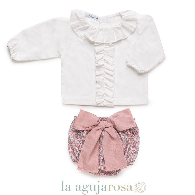 Para las niñas de entre 12 y 48 meses, este conjunto es ideal para celebraciones y reuniones familiares. Su diseño combina una camisa delicada con una braguita de volantes en color maquillaje.