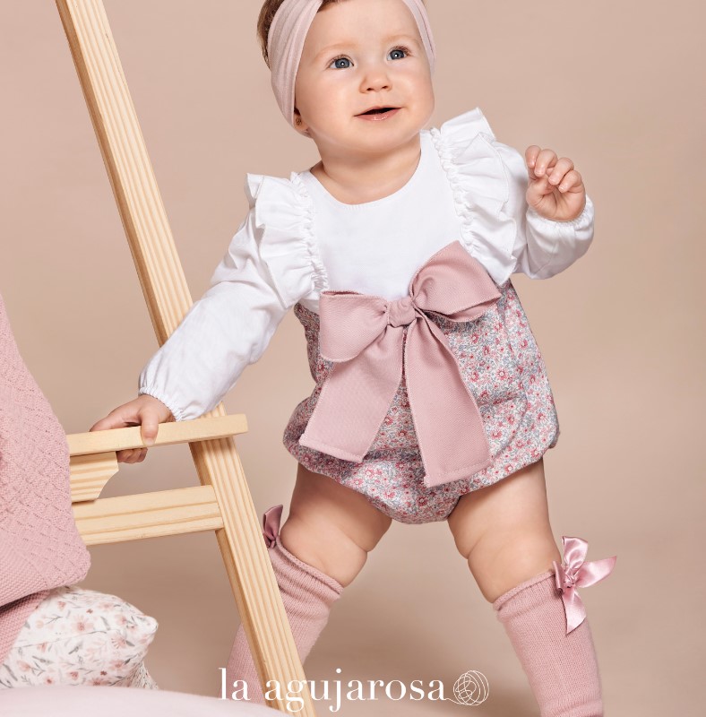 Este pelele es perfecto para las celebraciones. Su estampado de flores y el lazo delantero aportan un aire romático y delicado, ideal para bautizos o celebraciones familiares.