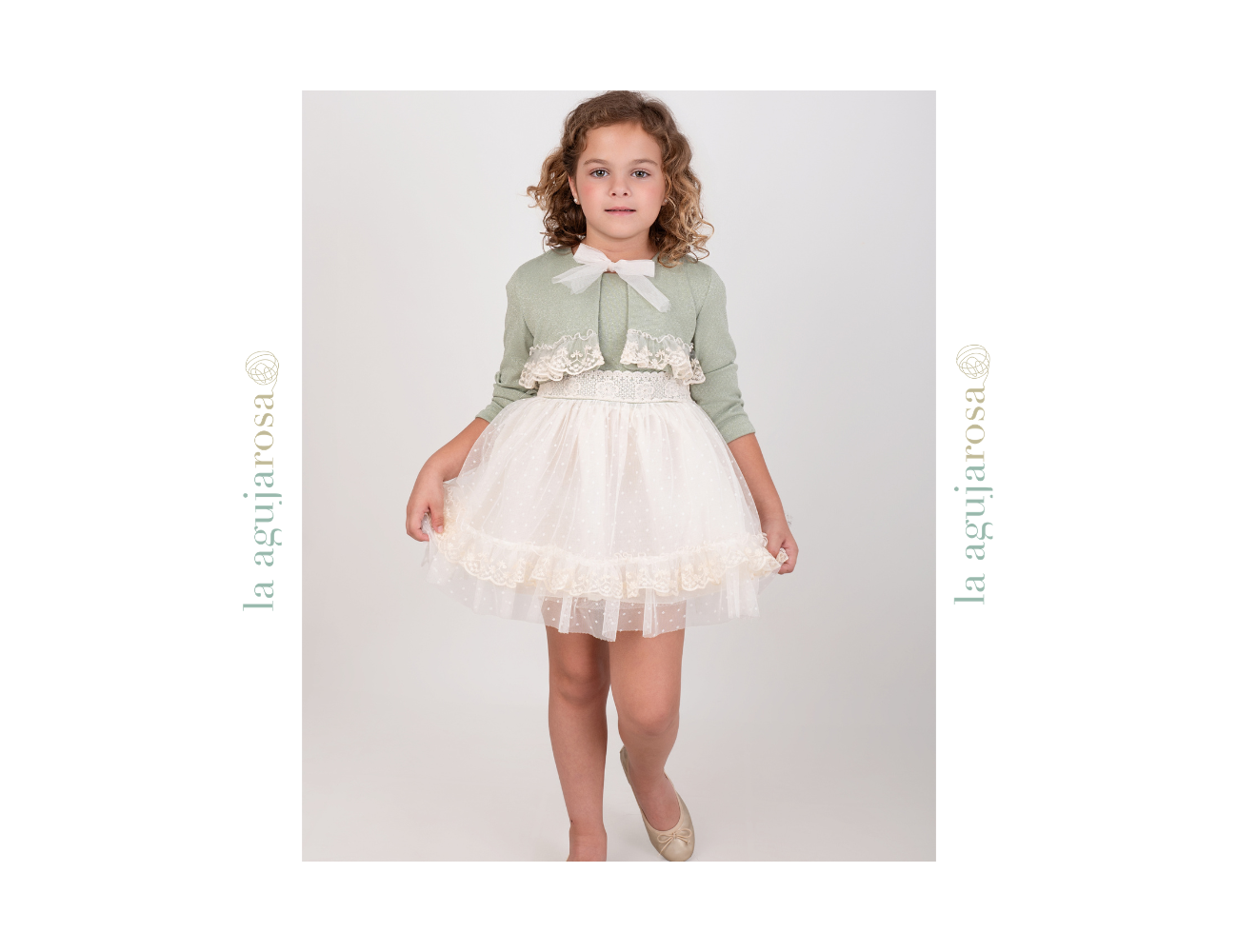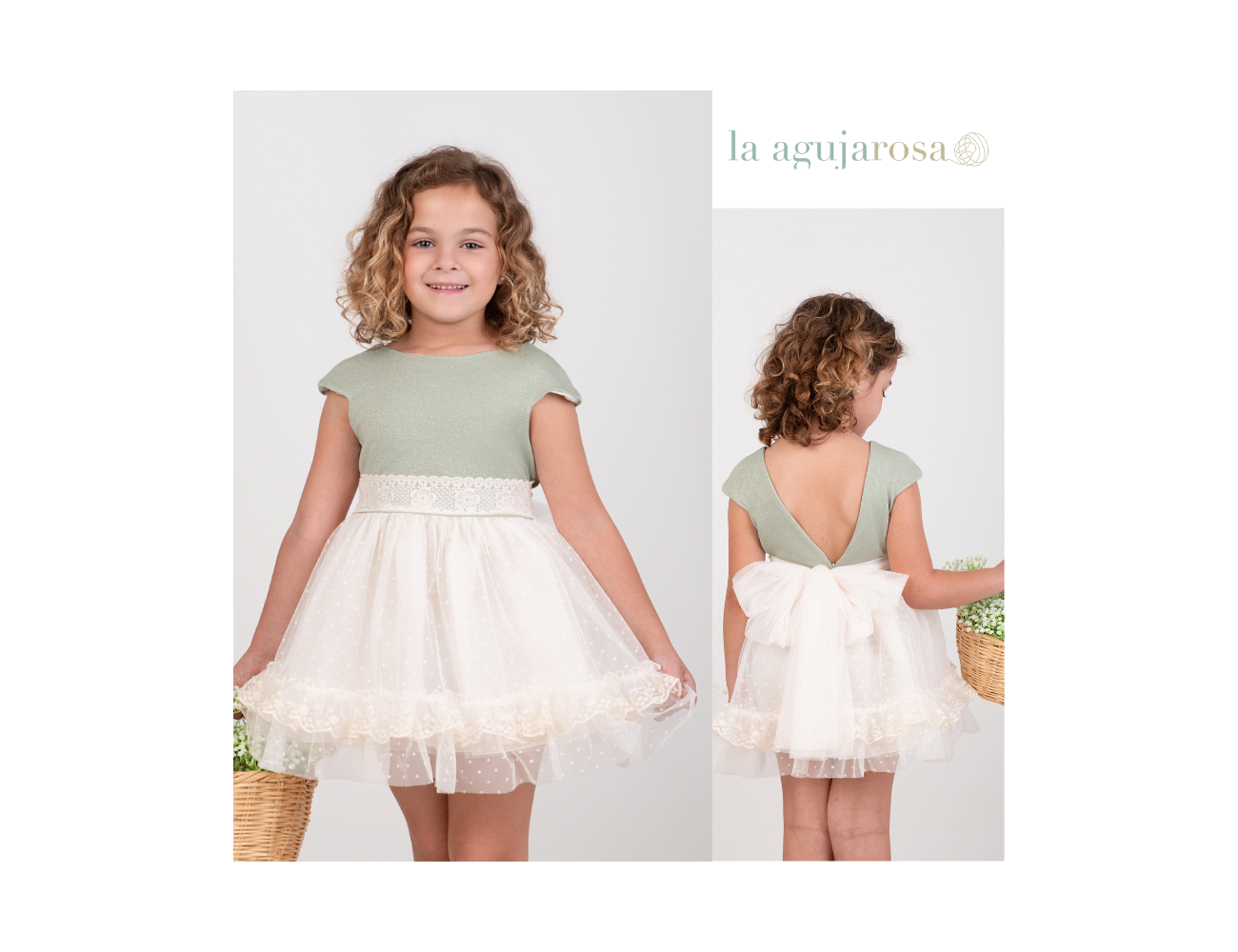 Nuevo vestido de ceremonia tirantes de talle bajo para niña de la nueva colección de Nekenia para esta primavera verano, confeccionado en verde mar y crudo donde destaca su preciosa espalda. FABRICADO EN ESPAÑA.
