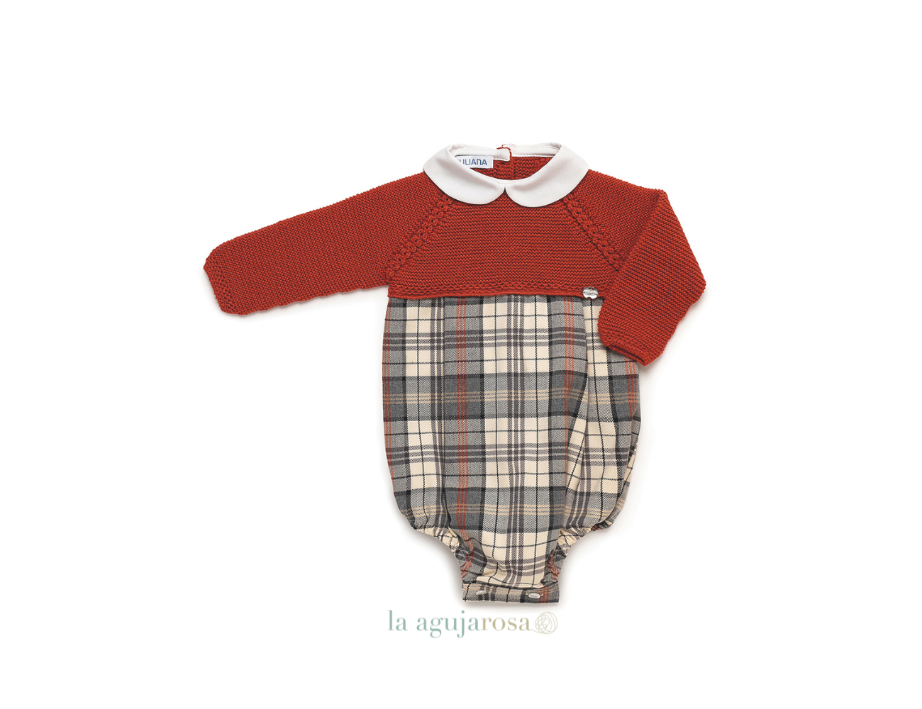 Pelele de punto y tela de cuadros de Juliana. Confeccionado de forma artesanal con fibras naturales, 50% acrílico 50% algodón de tacto fresco, delicado y dulce.