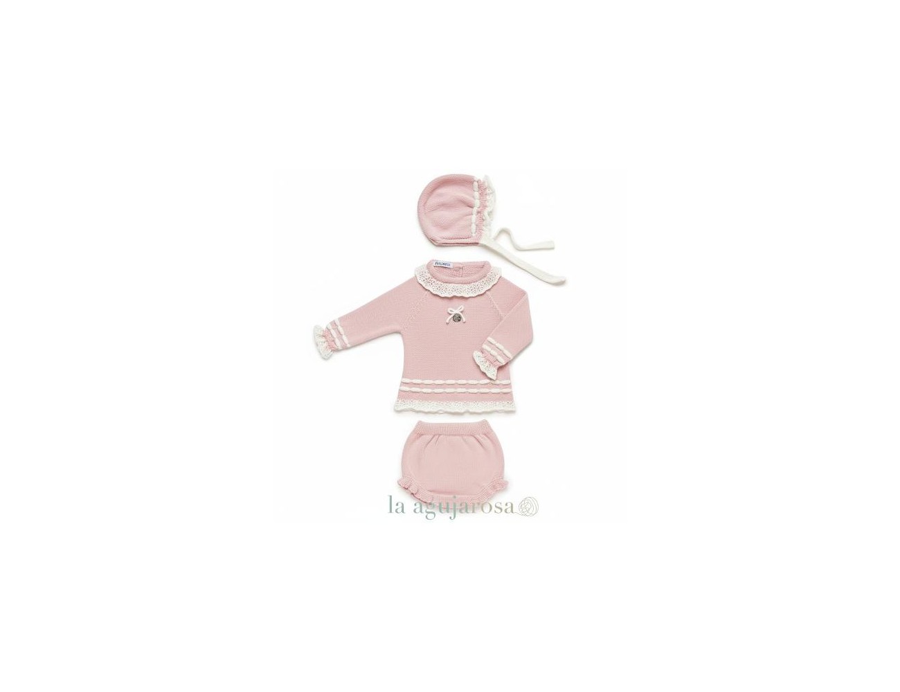 Conjunto de punto con braga de 3 piezas de Juliana. Confeccionado de forma artesanal con fibras naturales, 50% acrílico 50% algodón de tacto fresco, delicado y dulce.