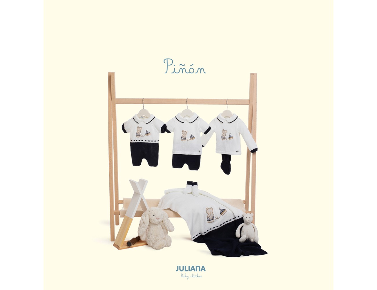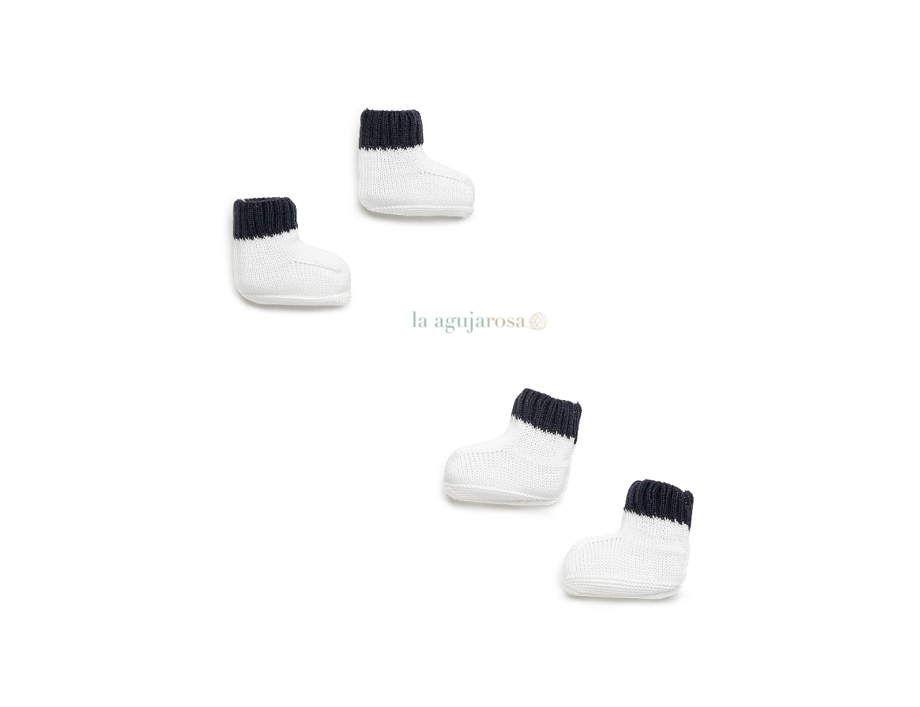 Bota de punto en blanco/marino de Juliana. Confeccionado de forma artesanal con fibras naturales, 50% acrílico 50% algodón de tacto fresco, delicado y dulce.