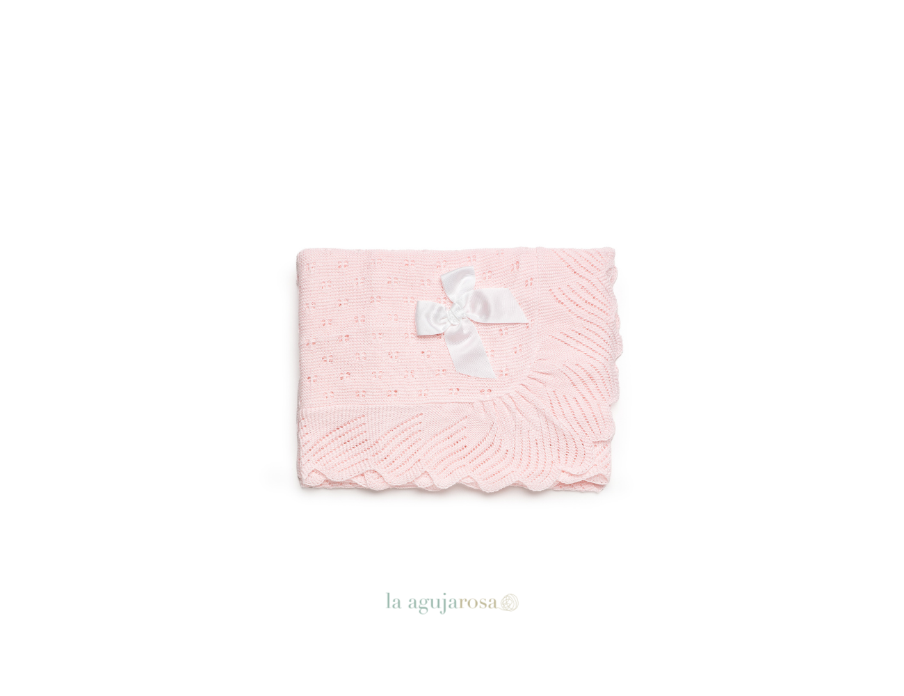 Preciosa toquilla de bebé de punto muy suave. Ideal para la época de primavera-verano. Confeccionada en España con la mejor calidad. La toquilla mide 1.10 de contorno y lleva un lazo de raso al tono. De tacto muy agradable especial para la delicada piel del recién nacido
