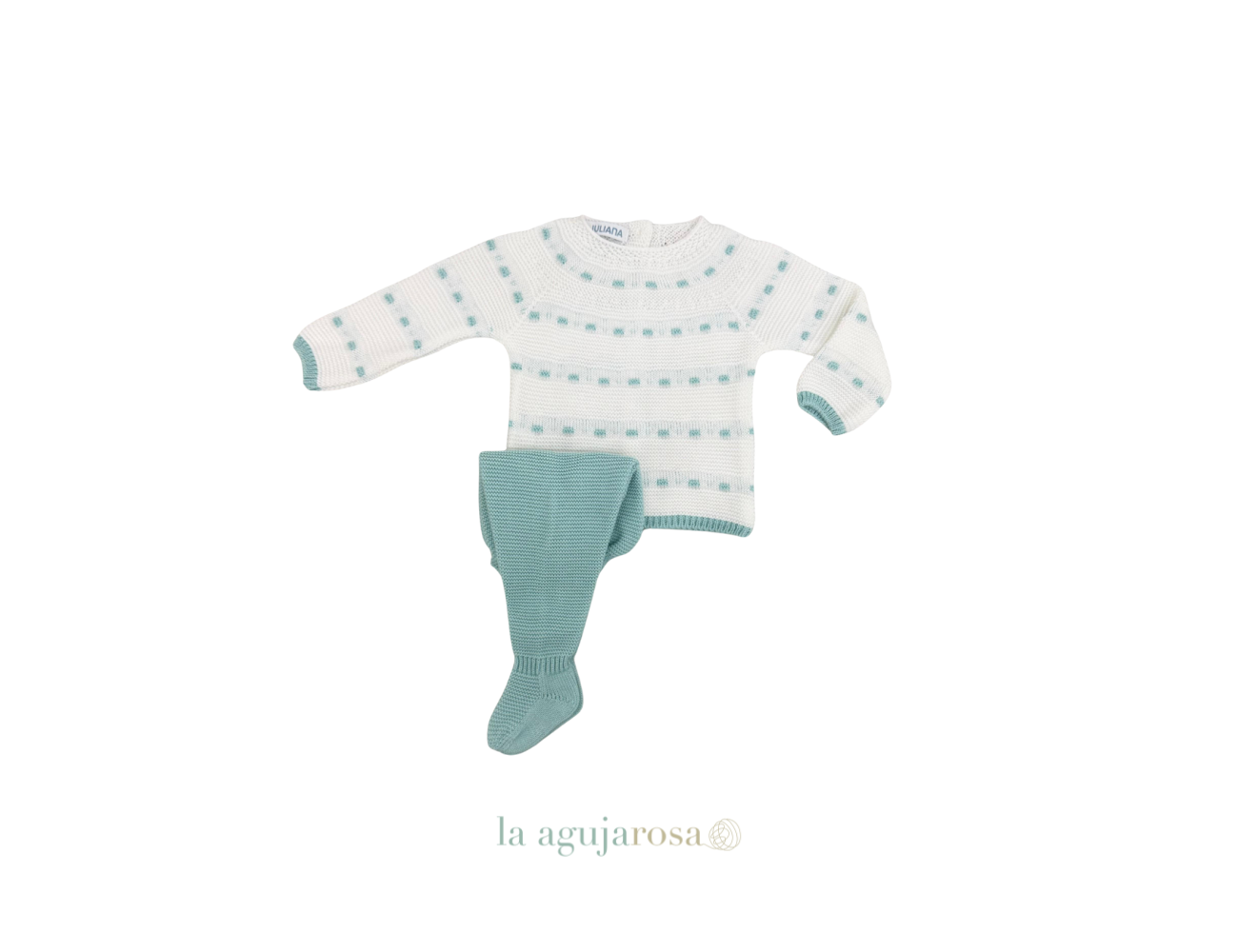 Conjunto de punto de 2 piezas en blanco con verde agua de Juliana. Confeccionado de forma artesanal con fibras naturales, 50% acrílico 50% algodón de tacto fresco, delicado y dulce.
