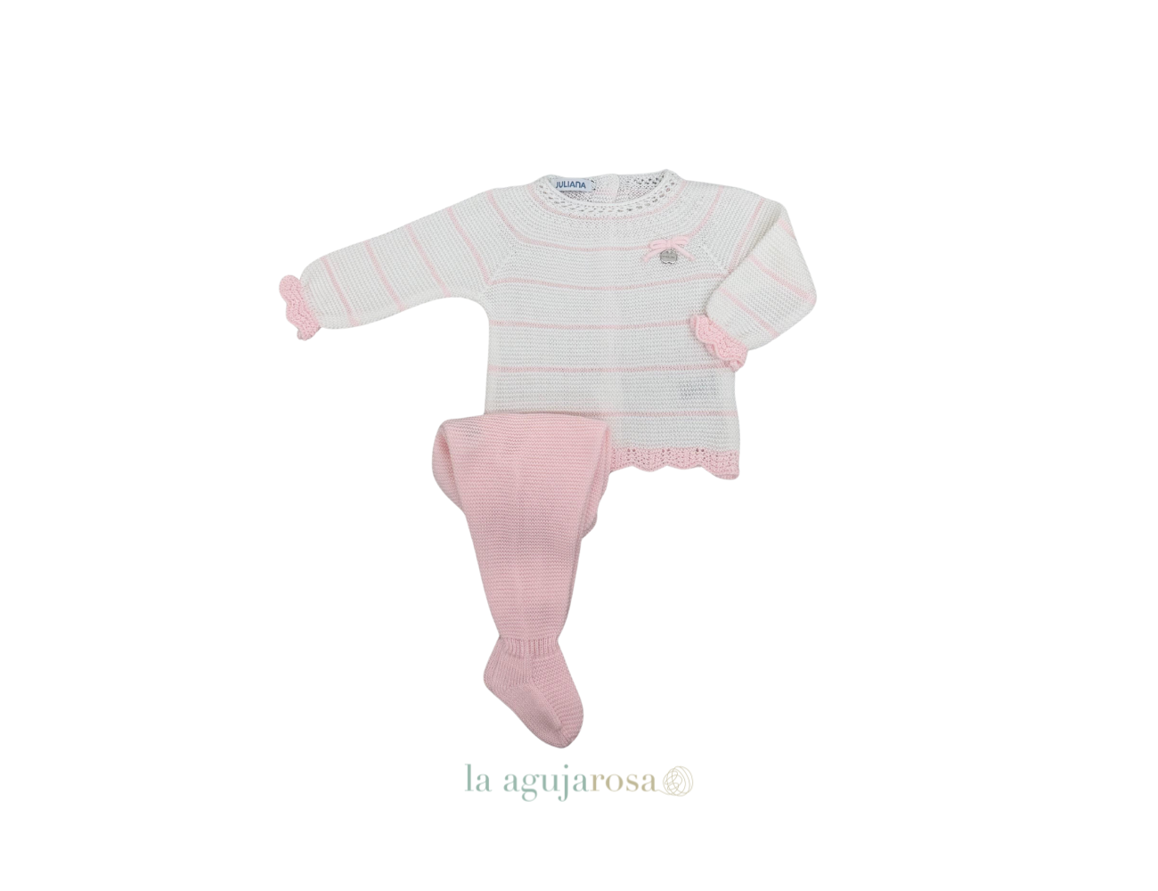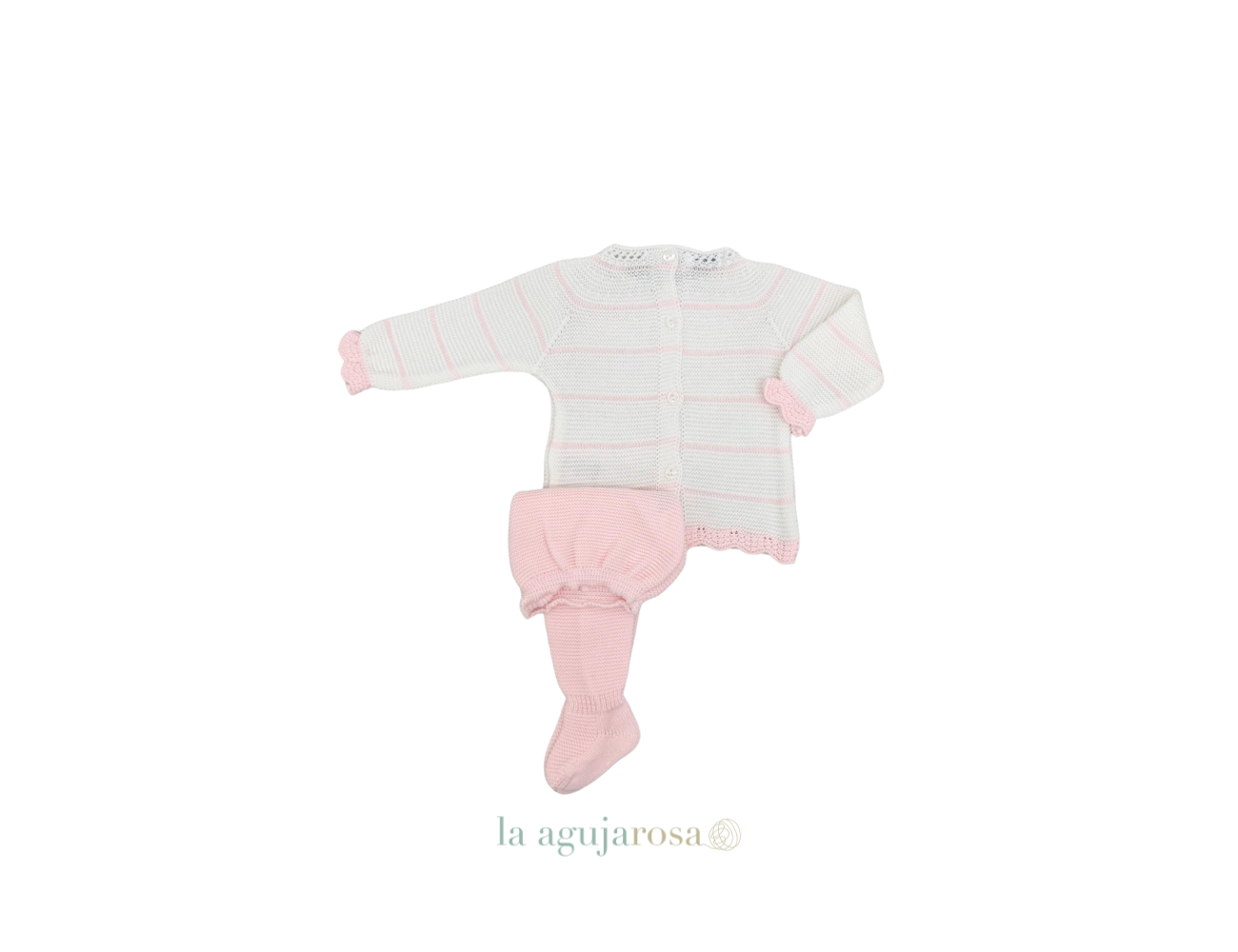 Conjunto de punto de 2 piezas rayado en blanco rosa de Juliana. Confeccionado de forma artesanal con fibras naturales, 50% acrílico 50% algodón de tacto fresco, delicado y dulce.