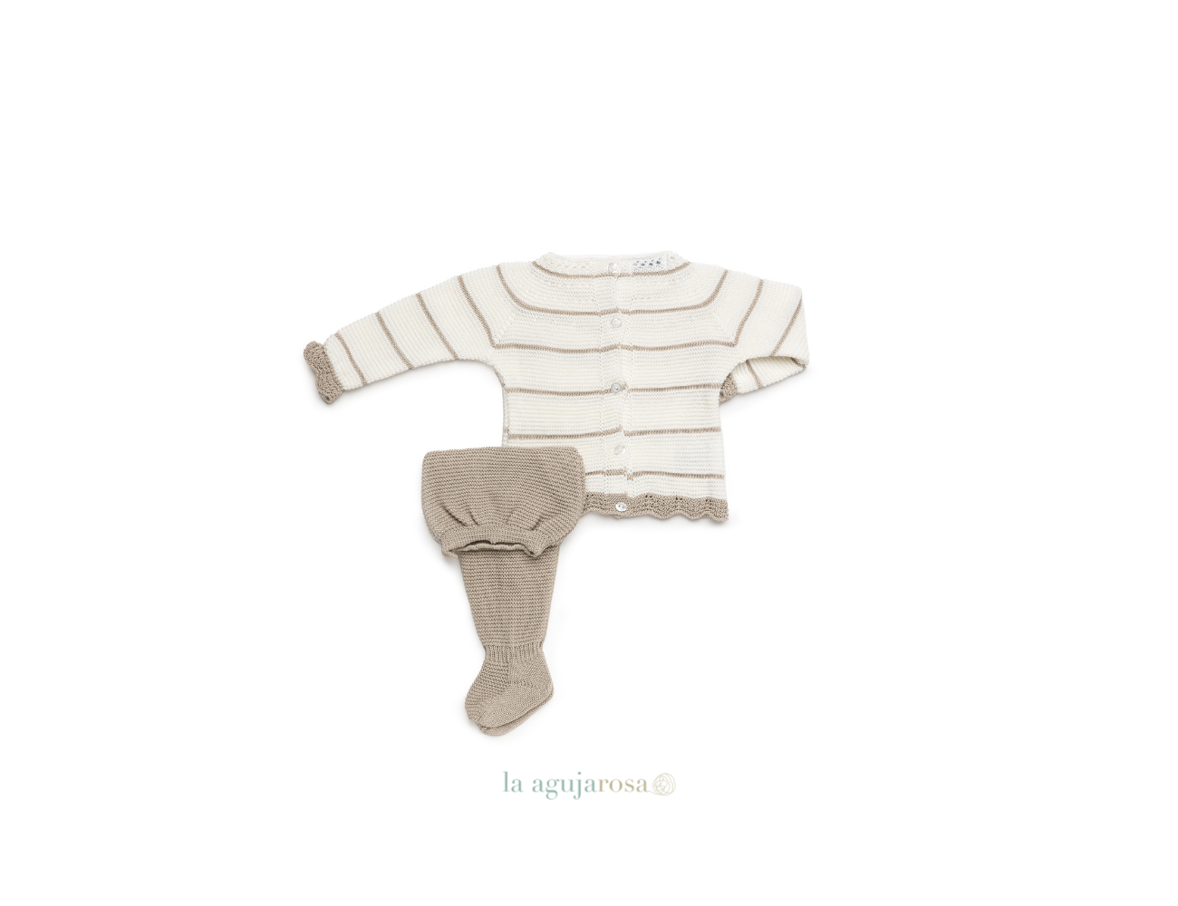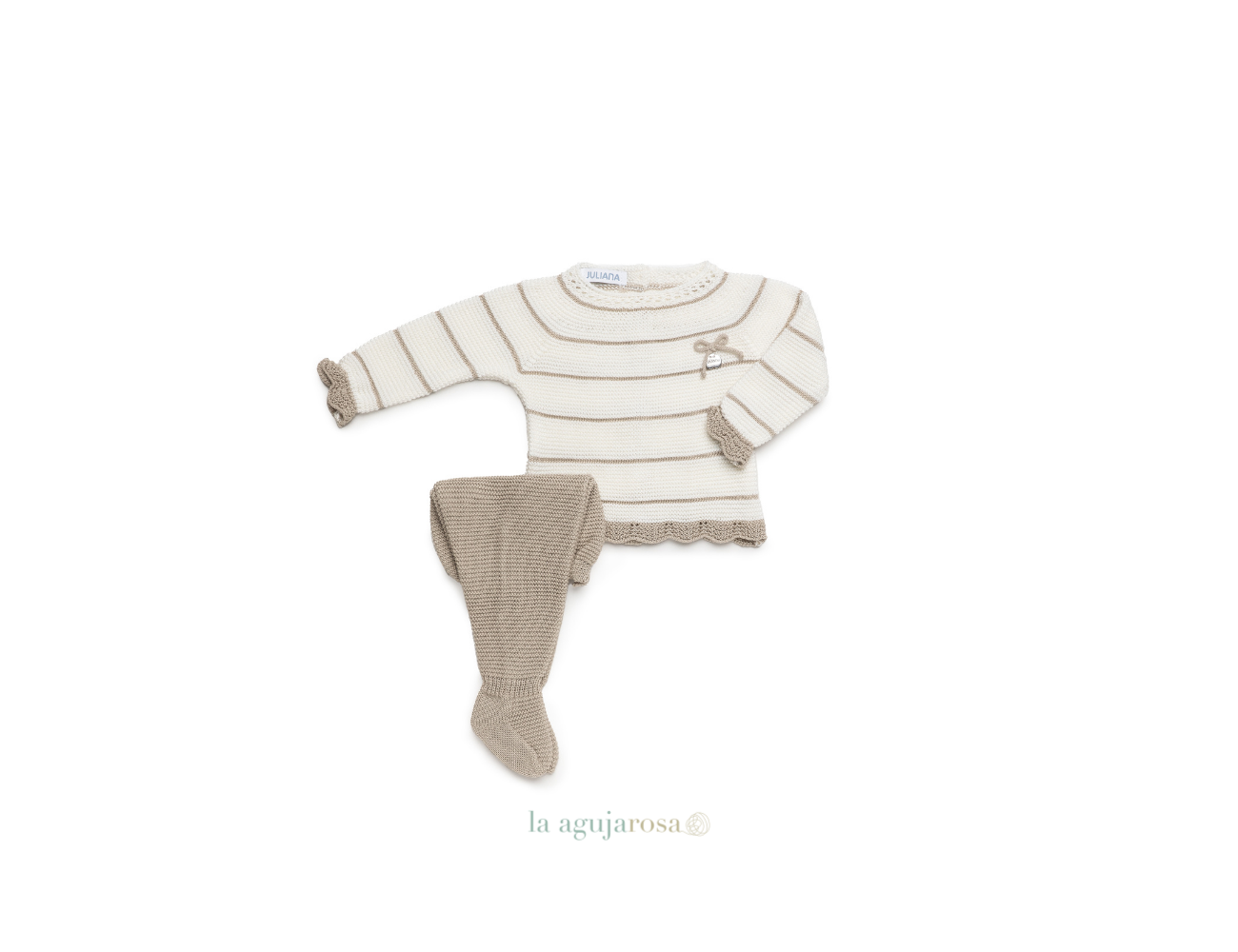 Conjunto de punto de 2 piezas rayado en crudo y beige de Juliana. Confeccionado de forma artesanal con fibras naturales, 50% acrílico 50% algodón de tacto fresco, delicado y dulce.