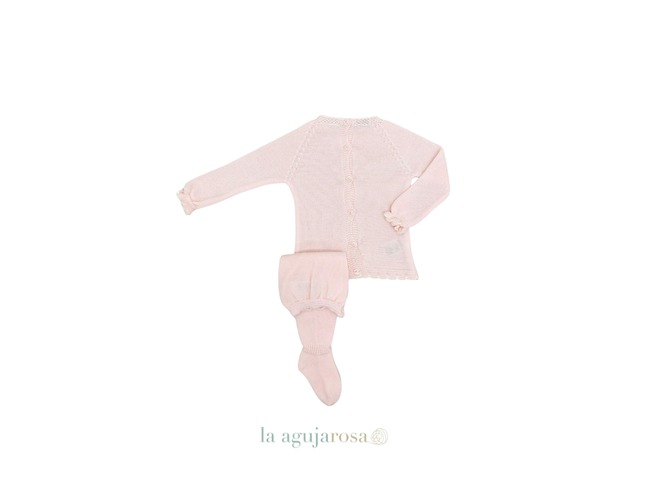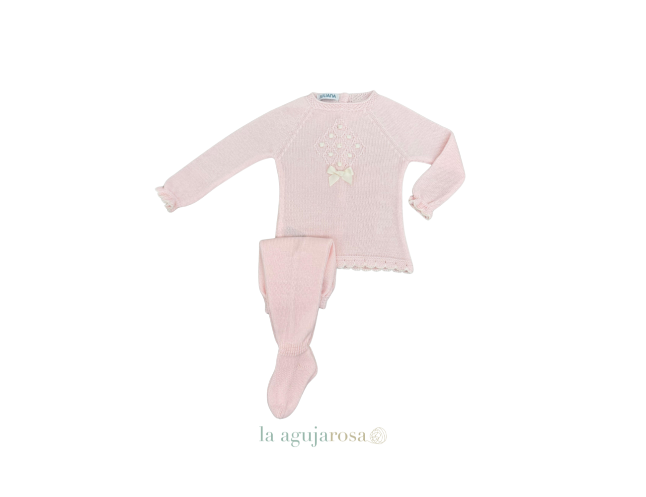 Conjunto de punto de 2 piezas en rosa crudo de Juliana. Confeccionado de forma artesanal con fibras naturales, 50% acrílico 50% algodón de tacto fresco, delicado y dulce.