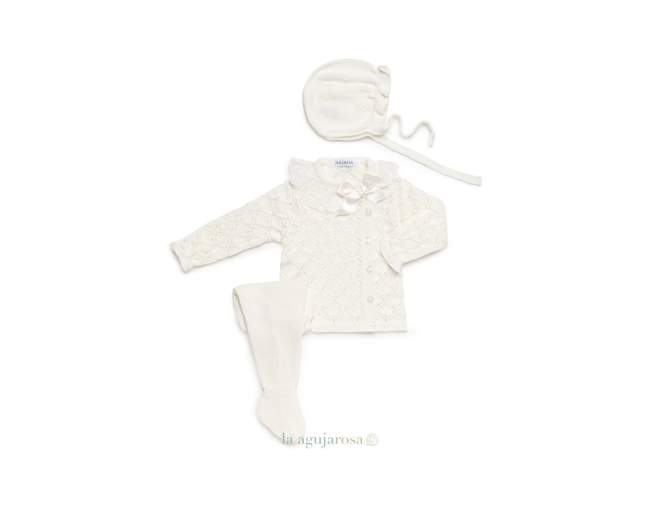 Conjunto de punto de 3 piezas calado rombos puntilla de Juliana. Confeccionado de forma artesanal con fibras naturales, 50% acrílico 50% algodón de tacto fresco, delicado y dulce.