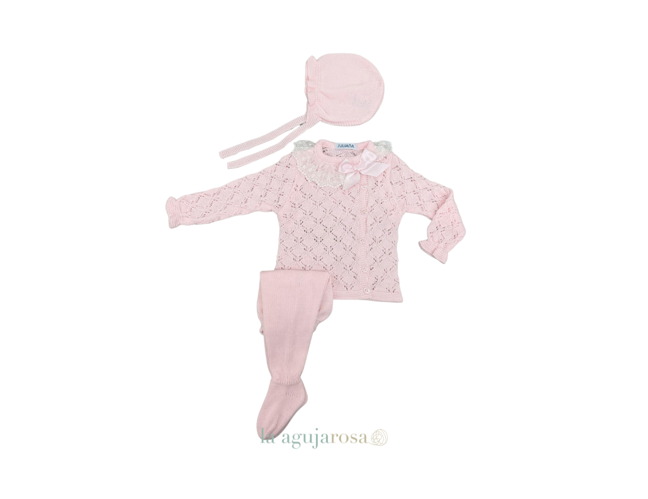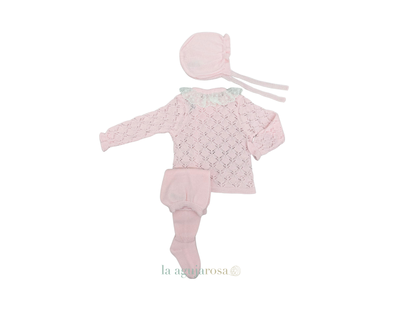 Conjunto de punto de 3 piezas calado rombos rosa puntilla de Juliana. Confeccionado de forma artesanal con fibras naturales, 50% acrílico 50% algodón de tacto fresco, delicado y dulce.