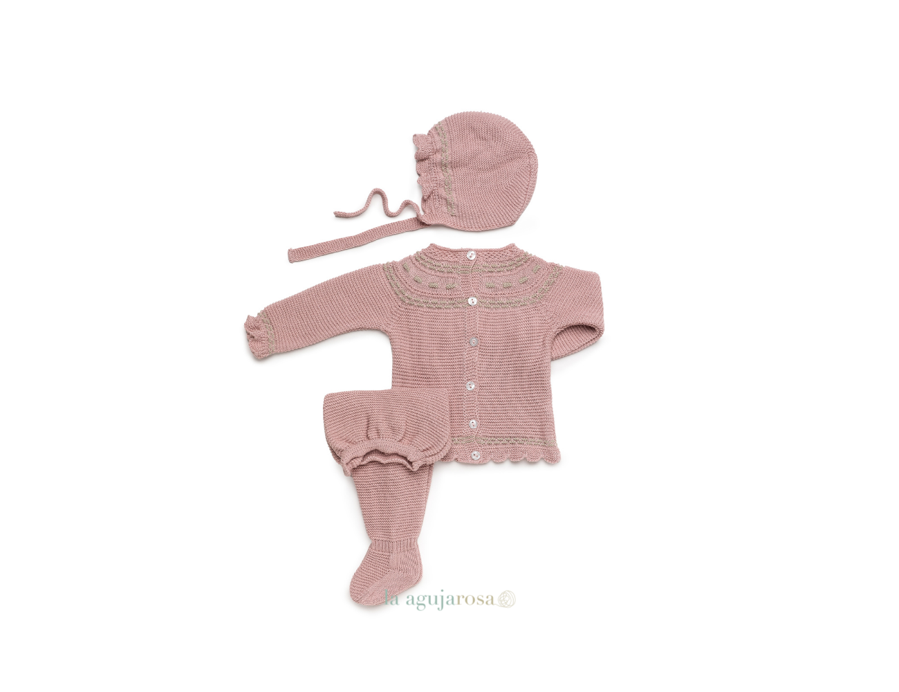 Conjunto de punto de 3 piezas en color rosa maquillaje con beige de Juliana. Confeccionado de forma artesanal con fibras naturales, 50% acrílico 50% algodón de tacto fresco, delicado y dulce.