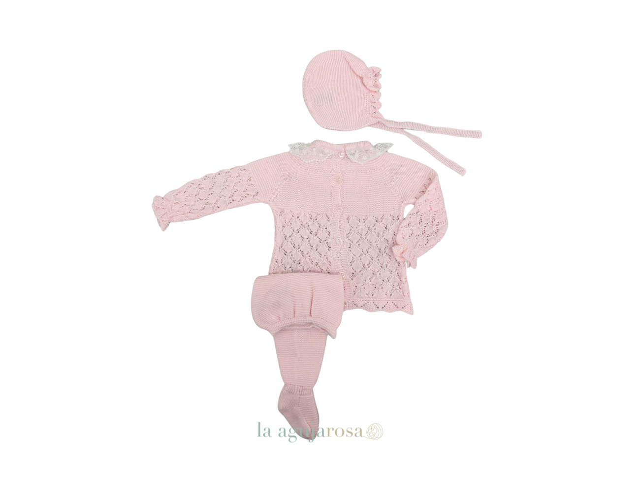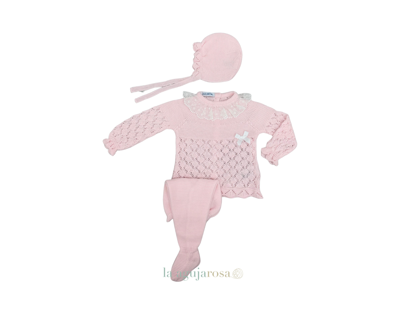Conjunto de punto de 3 piezas caldo puntilla rosa de Juliana. Confeccionado de forma artesanal con fibras naturales, 50% acrílico 50% algodón de tacto fresco, delicado y dulce.
