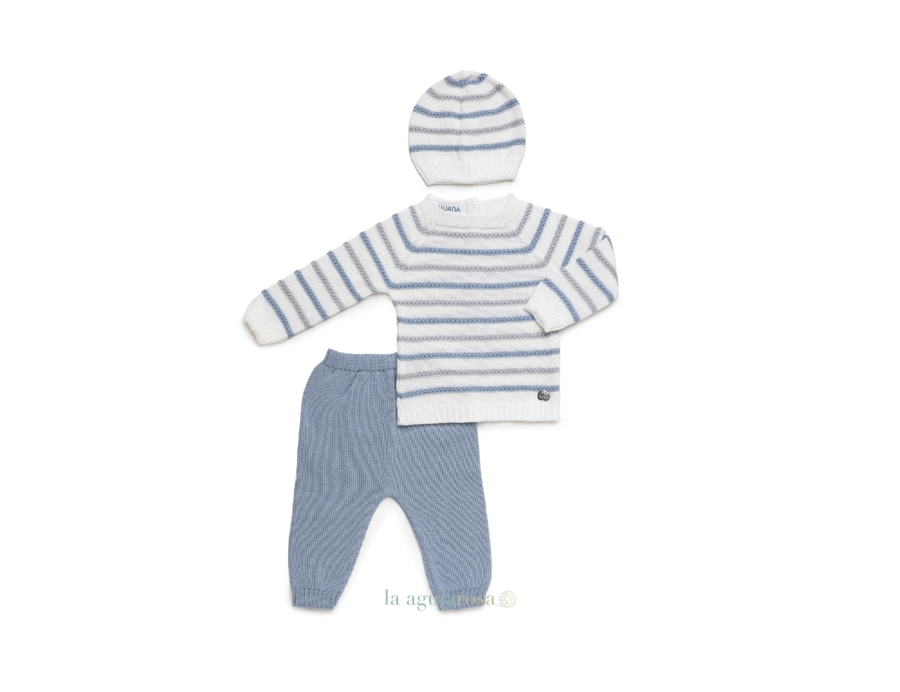 Conjunto de punto de 3 piezas con lines de colores de Juliana. Confeccionado de forma artesanal con fibras naturales, 50% acrílico 50% algodón de tacto fresco, delicado y dulce.