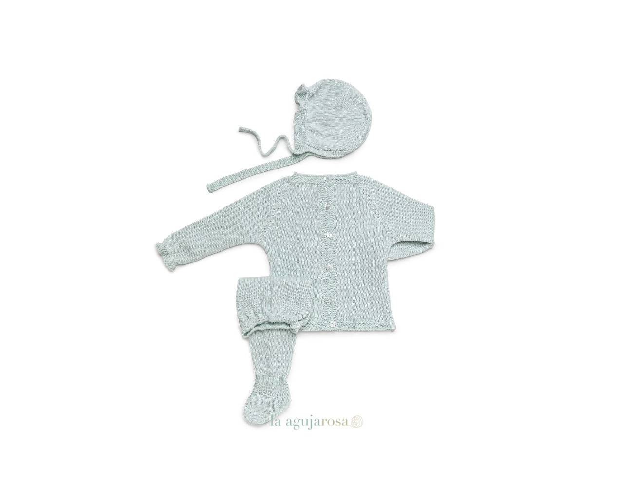 Conjunto de punto con gorro en verde mar de Juliana. Confeccionado de forma artesanal con fibras naturales, 50% acrílico 50% algodón de tacto fresco, delicado y dulce.