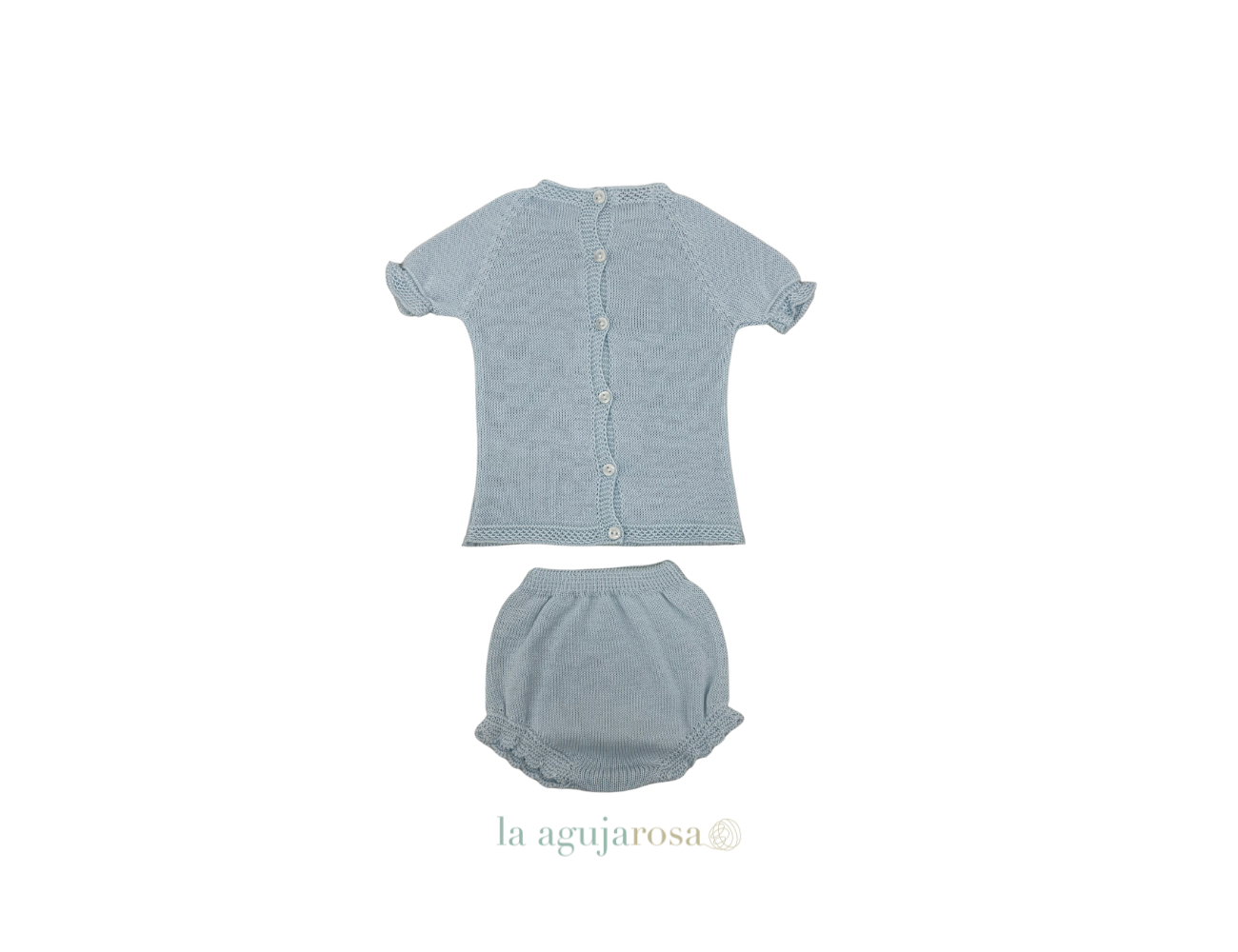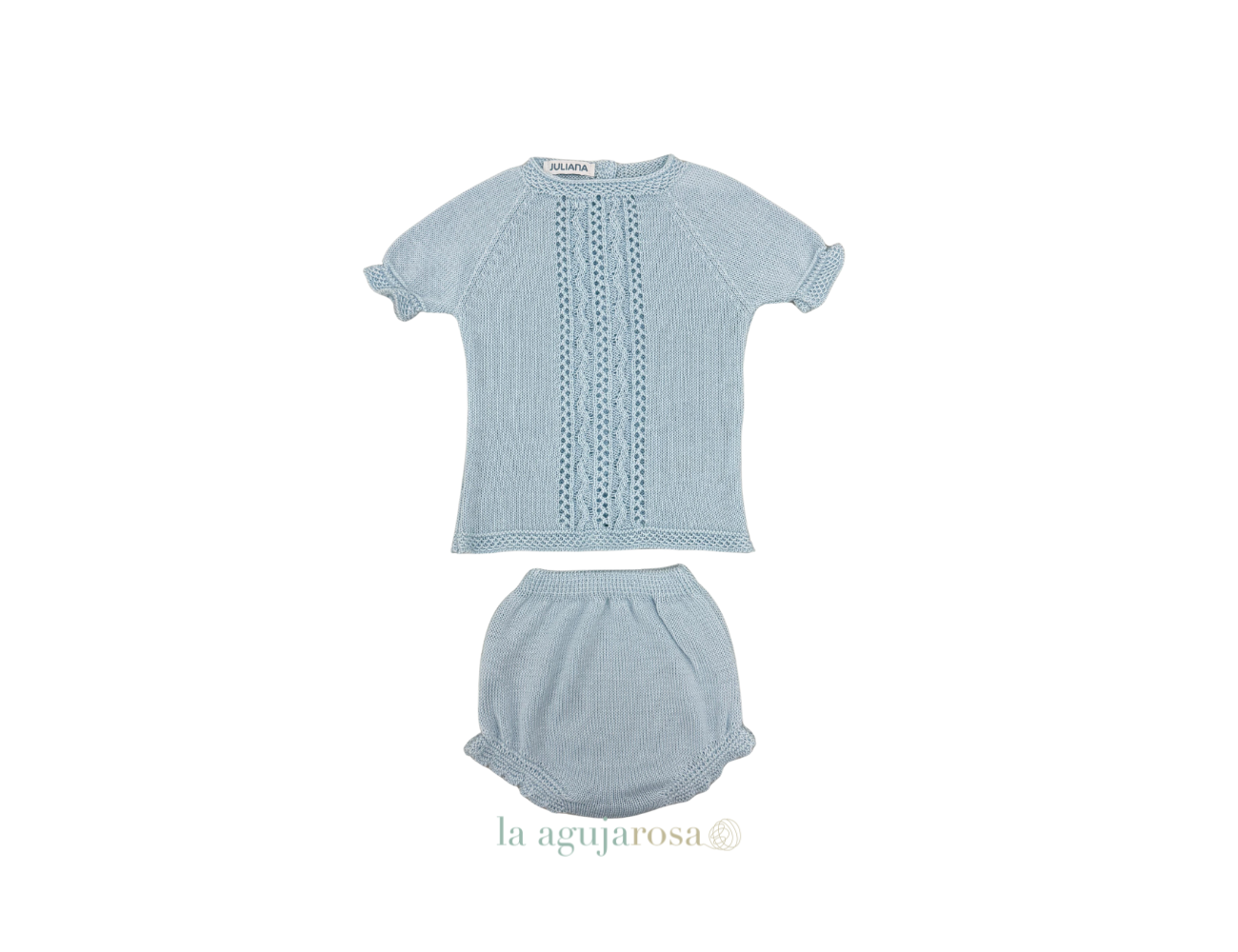 Conjunto de punto con braga en celeste de Juliana. Confeccionado de forma artesanal con fibras naturales, 50% acrílico 50% algodón de tacto fresco, delicado y dulce.