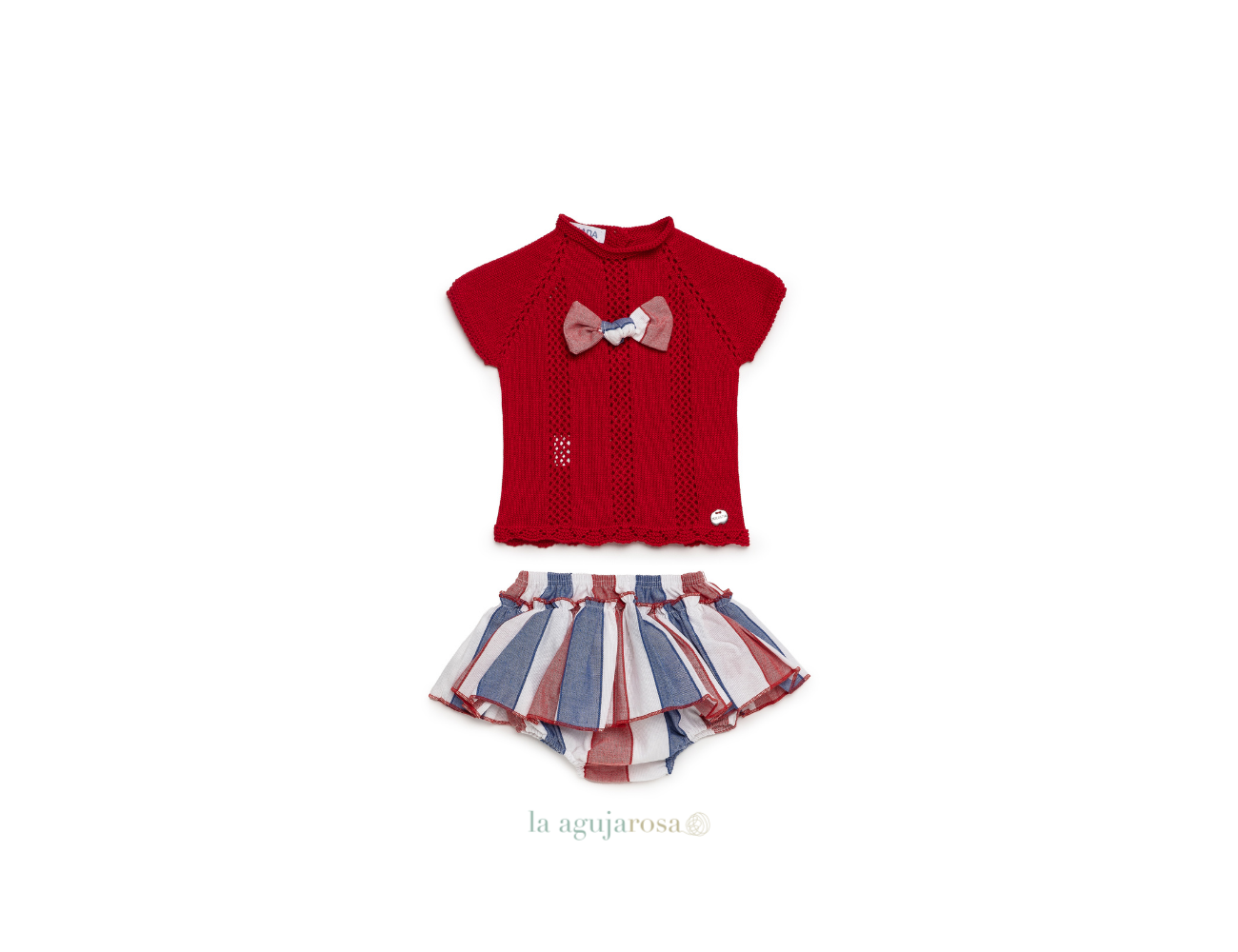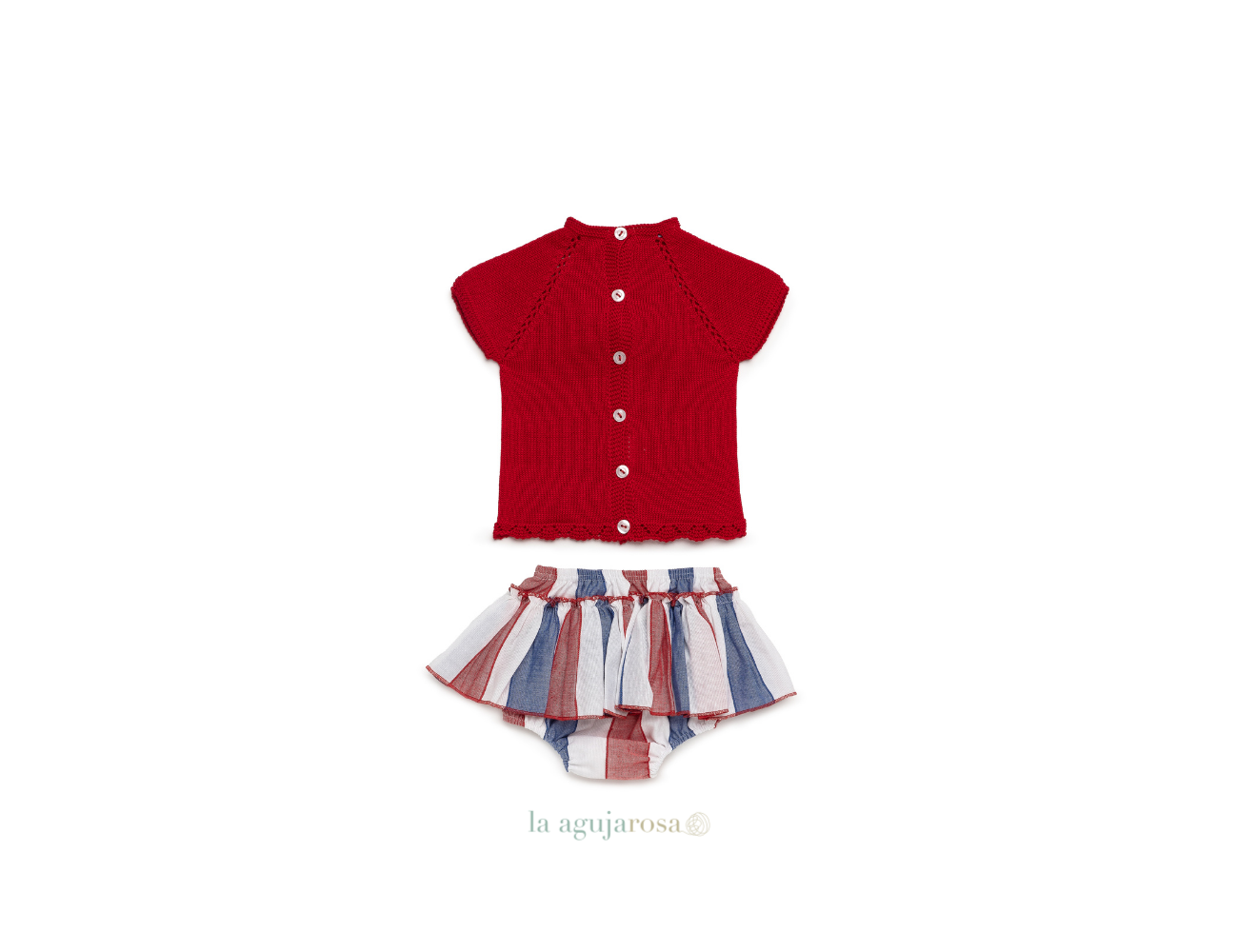 Conjunto braga volante tela rayada de Juliana. Confeccionado en España con la mejor calidad de forma artesanal con fibras naturales, 100% algodón la tela 50% algodón 50% leacril el punto.