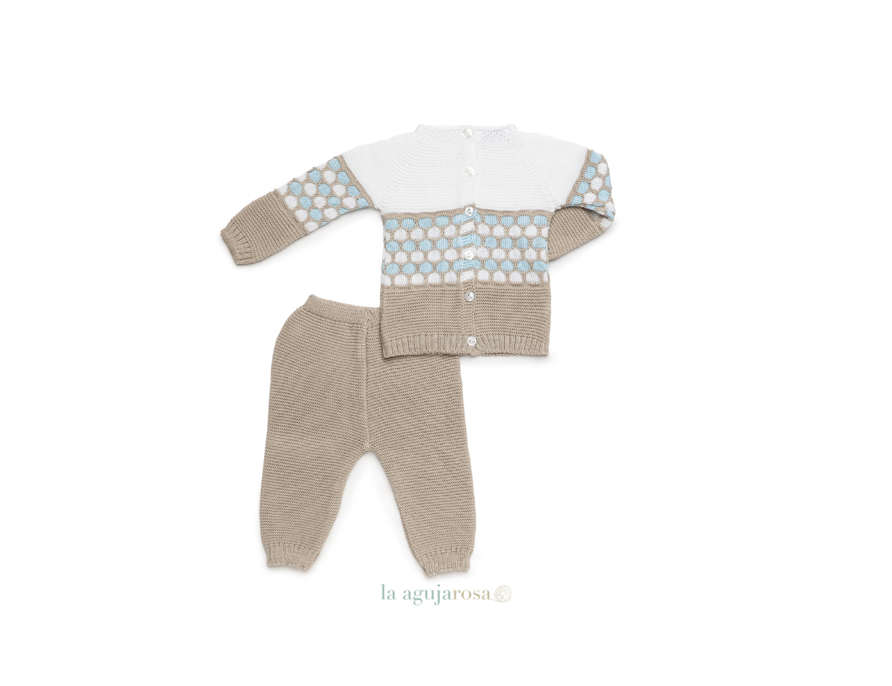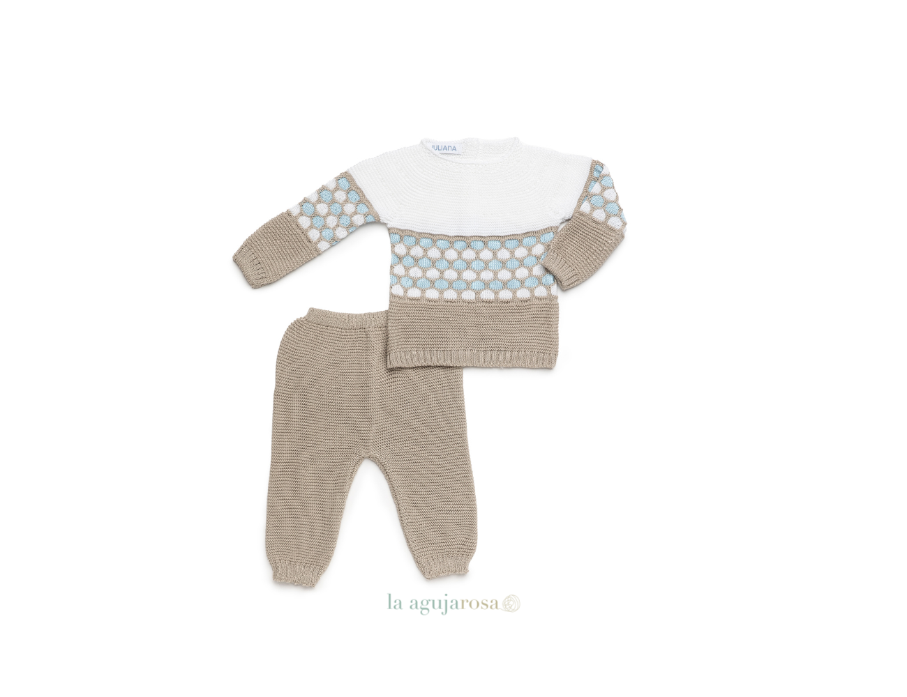 Conjunto de punto de 2 piezas lin cenefa de Juliana. Confeccionado de forma artesanal con fibras naturales, 50% acrílico 50% algodón de tacto fresco, delicado y dulce.