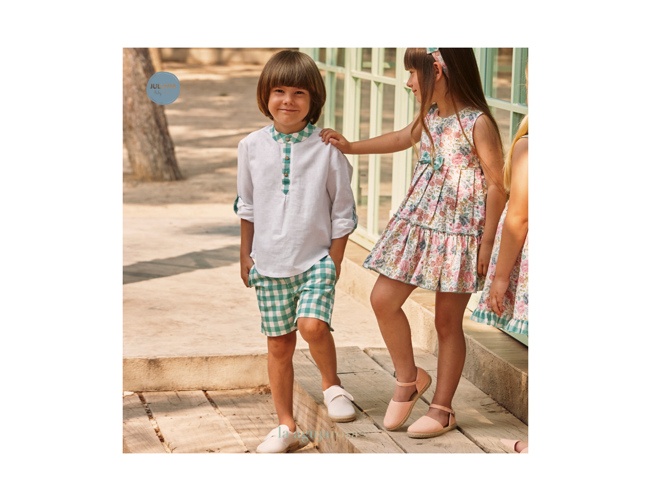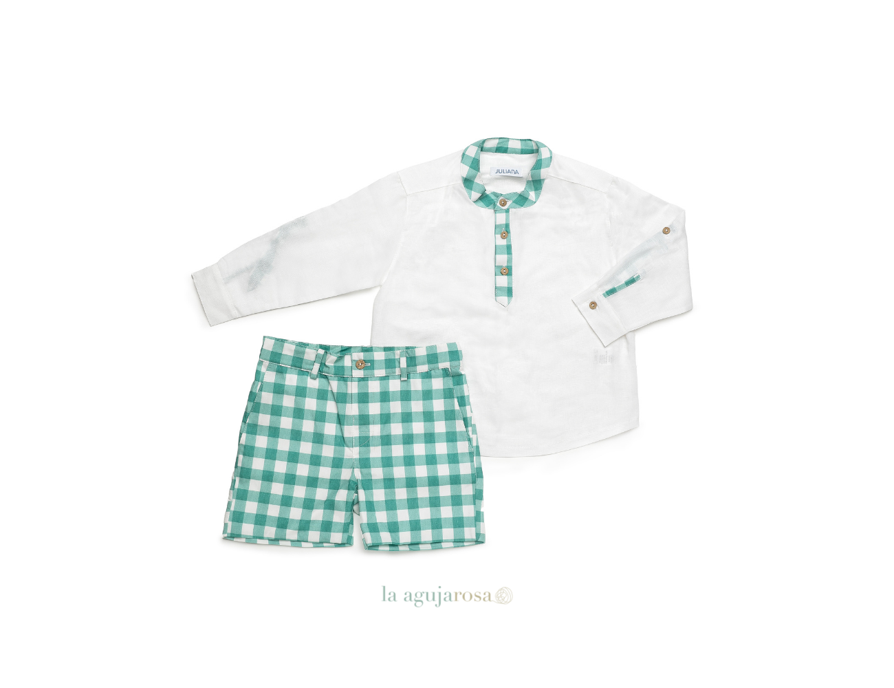 Conjunto de niño con camisa de mangalarga y pantalón de cuadros de Juliana. Confeccionado en España con la mejor calidad de forma artesanal con fibras naturales, 100% algodón.