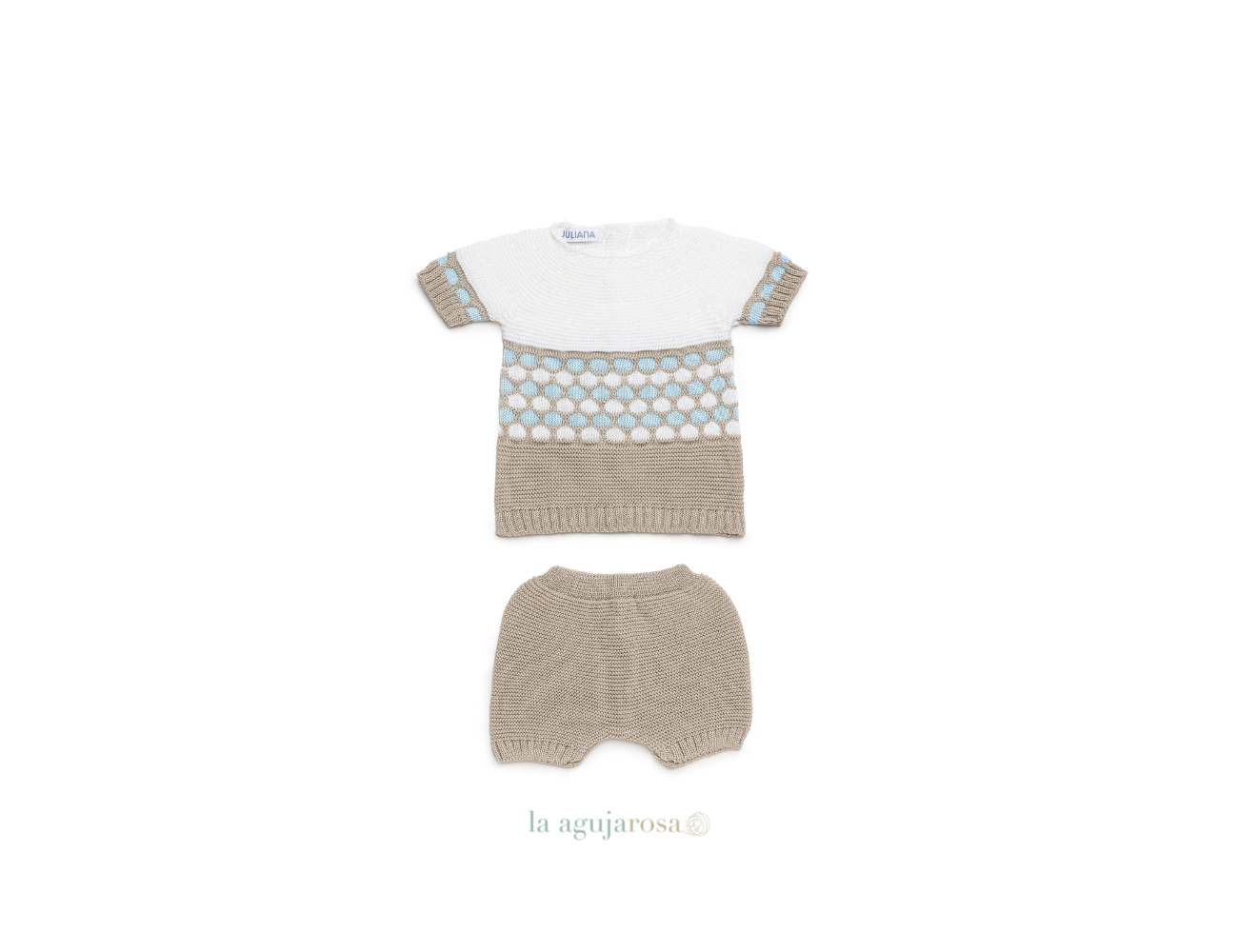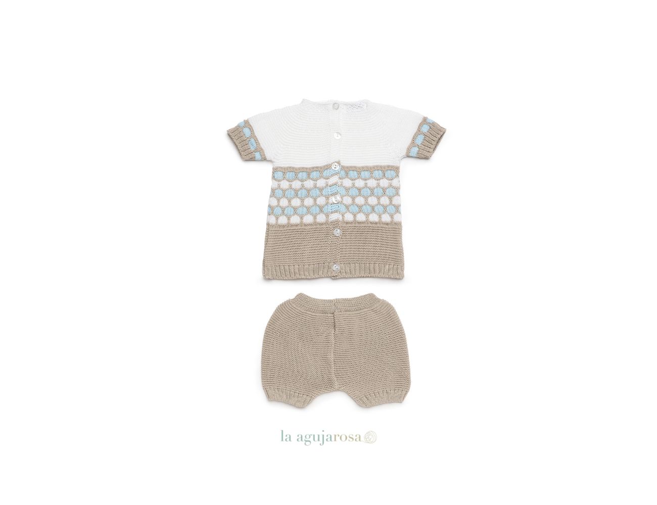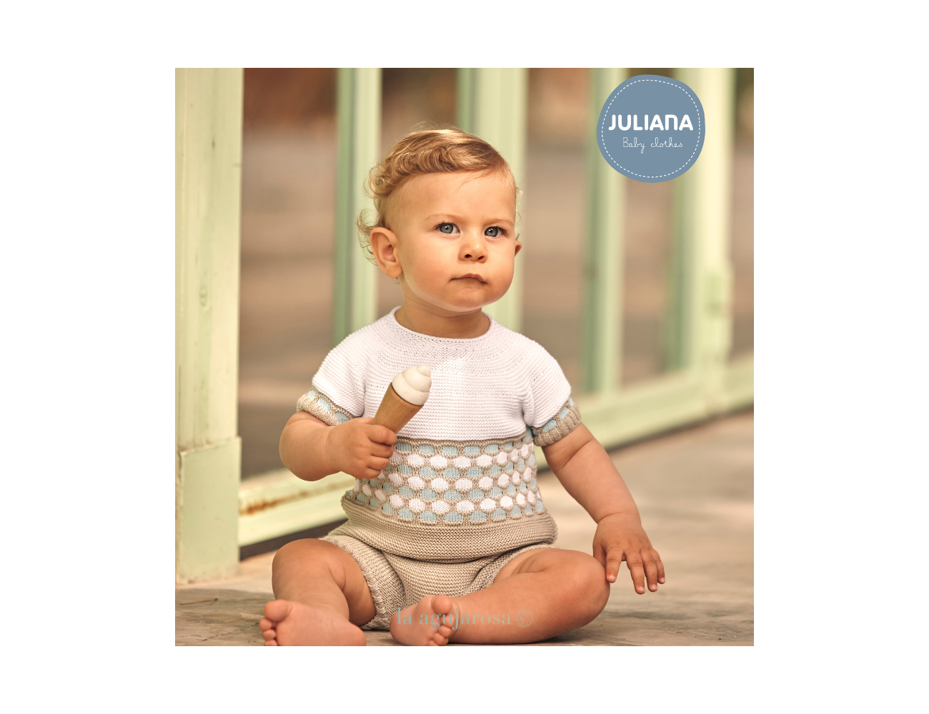 Conjunto de punto pantalón de 2 piezas lin cenefa de Juliana. Confeccionado de forma artesanal con fibras naturales, 50% acrílico 50% algodón de tacto fresco, delicado y dulce.