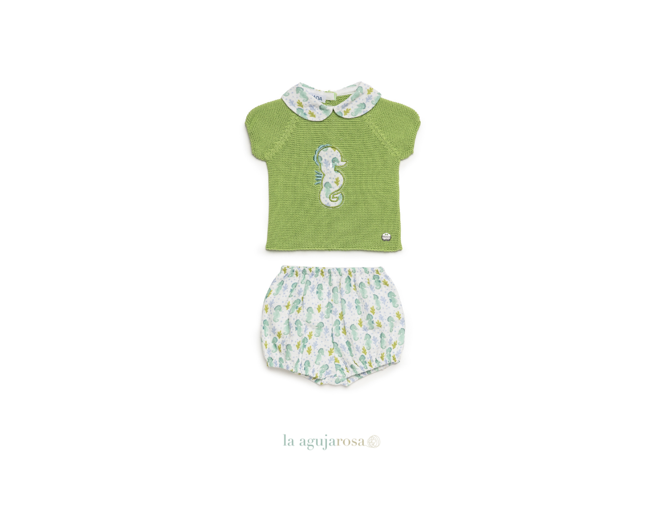 Conjunto pantalón en tonos lima de Juliana. Confeccionado en España con la mejor calidad de forma artesanal con fibras naturales, 100% algodón la tela 50% algodón 50% leacril el punto.