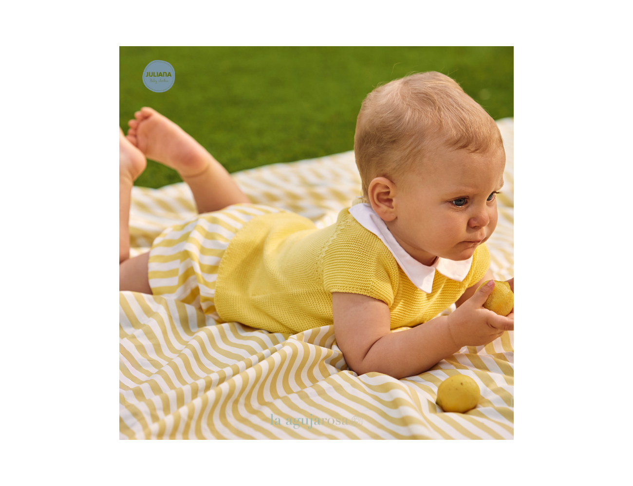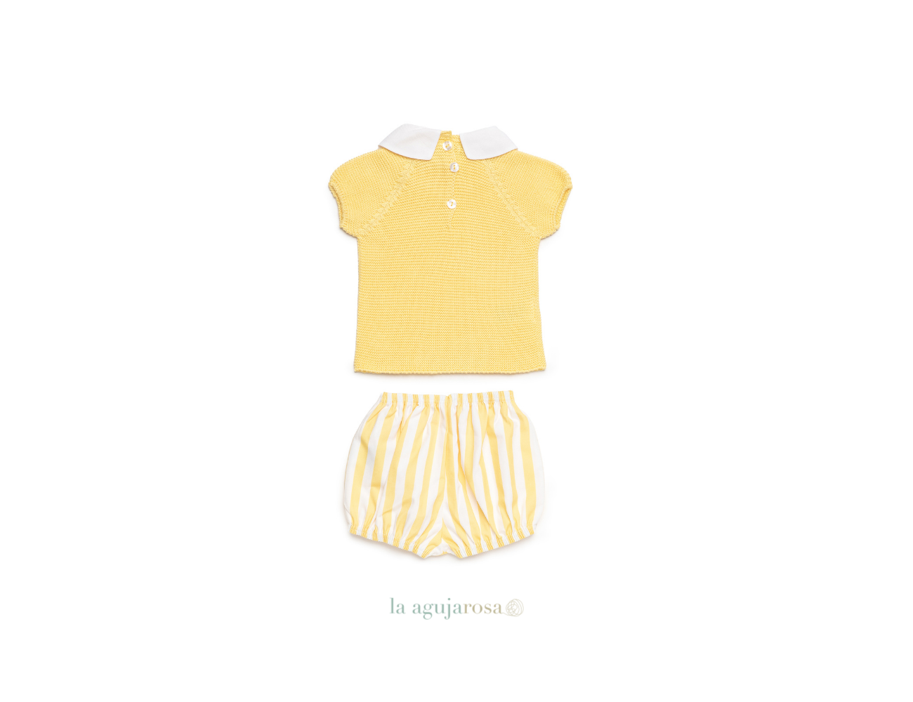 Conjunto de pantalón de tela rayada en color amarillo de Juliana. Confeccionado de forma artesanal con fibras naturales, 50% acrílico 50% algodón de tacto fresco, delicado y dulce.