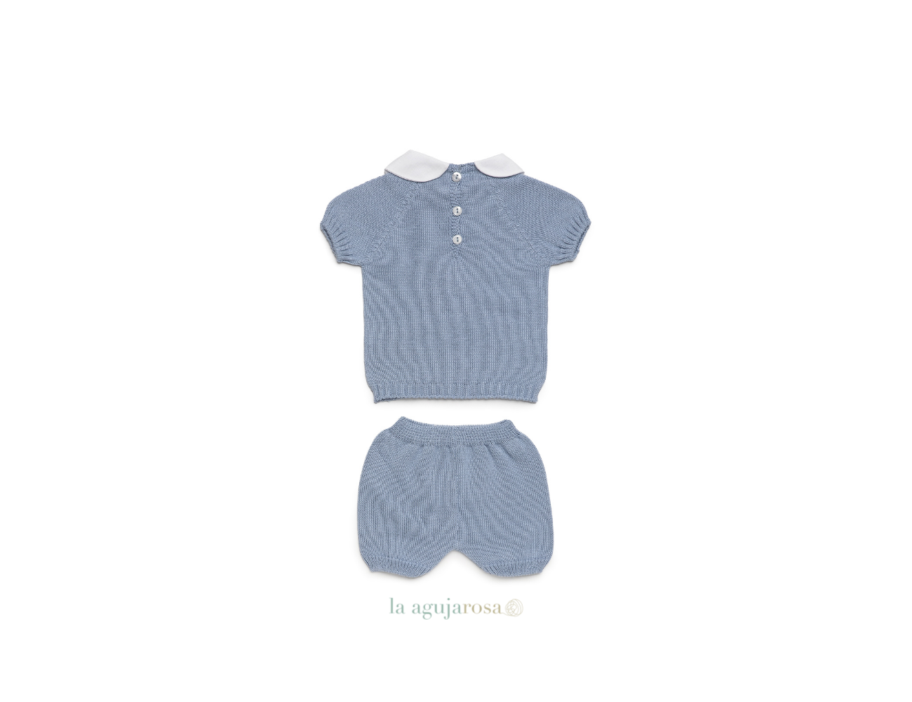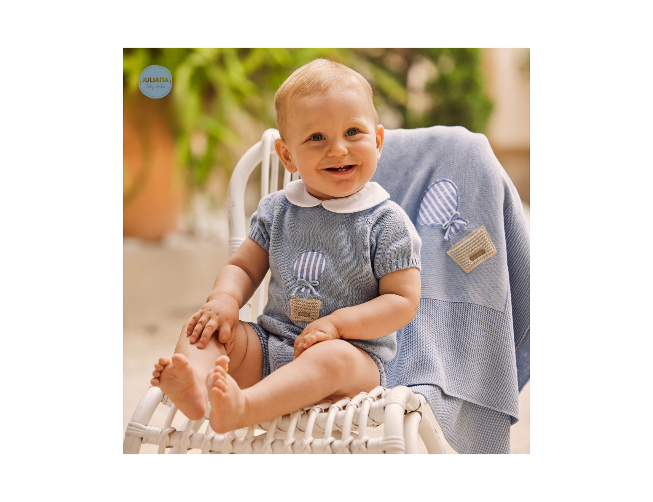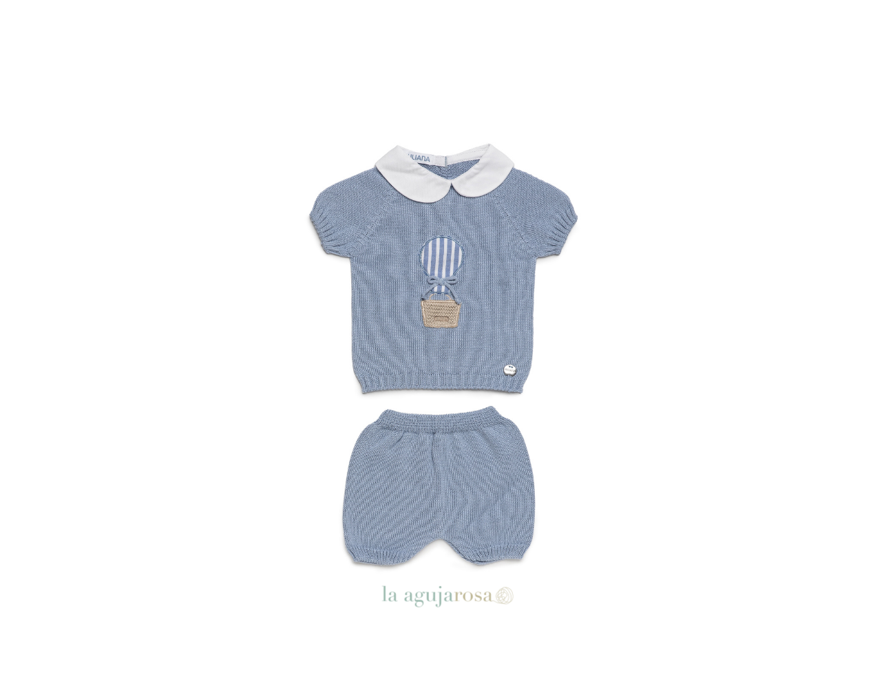 Conjunto de punto de pantalón y jersey bordado globo de Juliana. Confeccionado de forma artesanal con fibras naturales, 50% acrílico 50% algodón de tacto fresco, delicado y dulce.