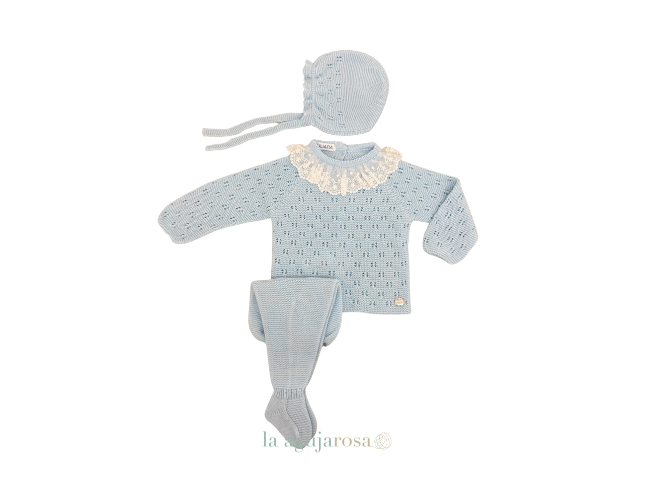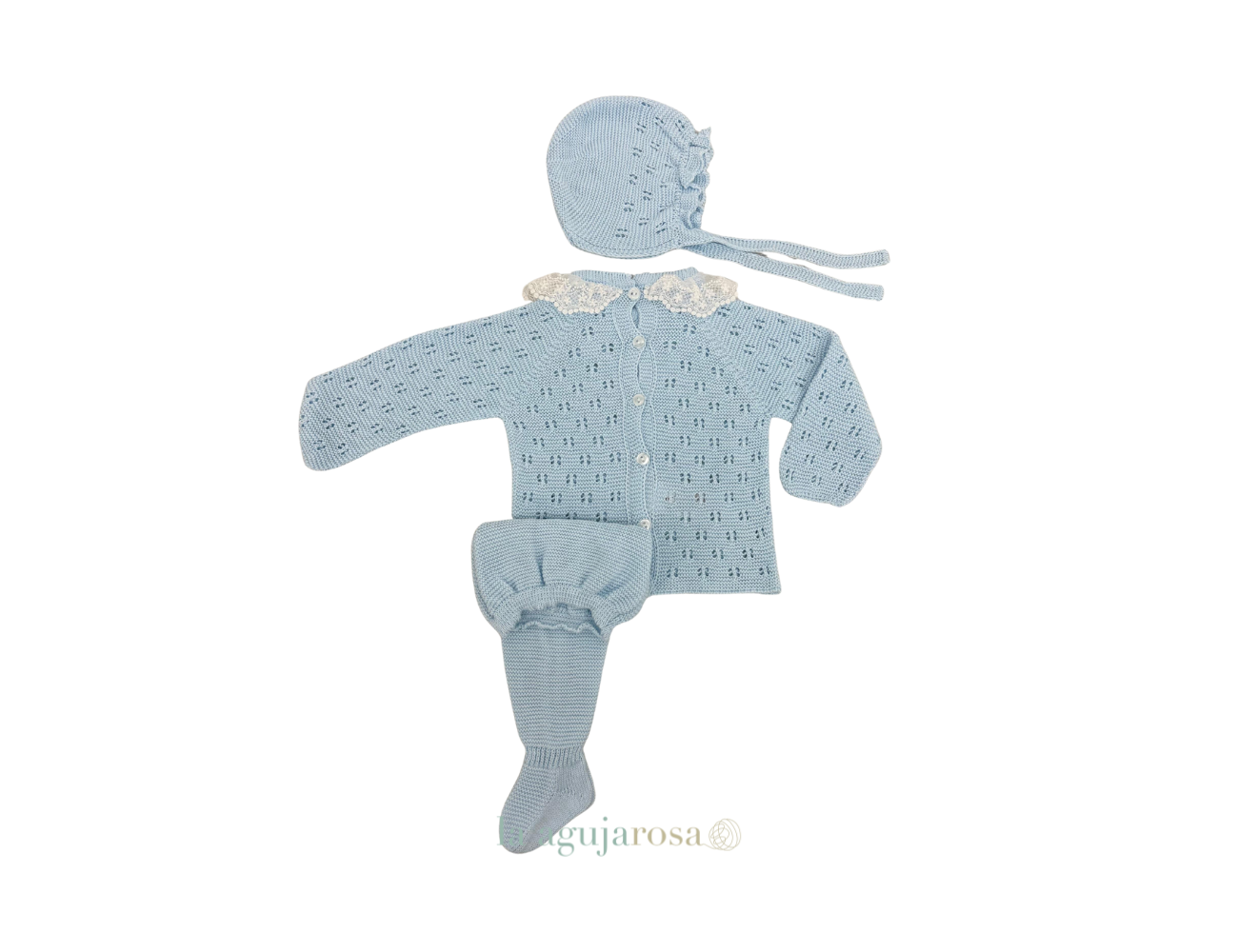 Conjunto de punto de 3 piezas en colorceleste bebé de Juliana. Confeccionado de forma artesanal con fibras naturales, 50% acrílico 50% algodón de tacto fresco, delicado y dulce.