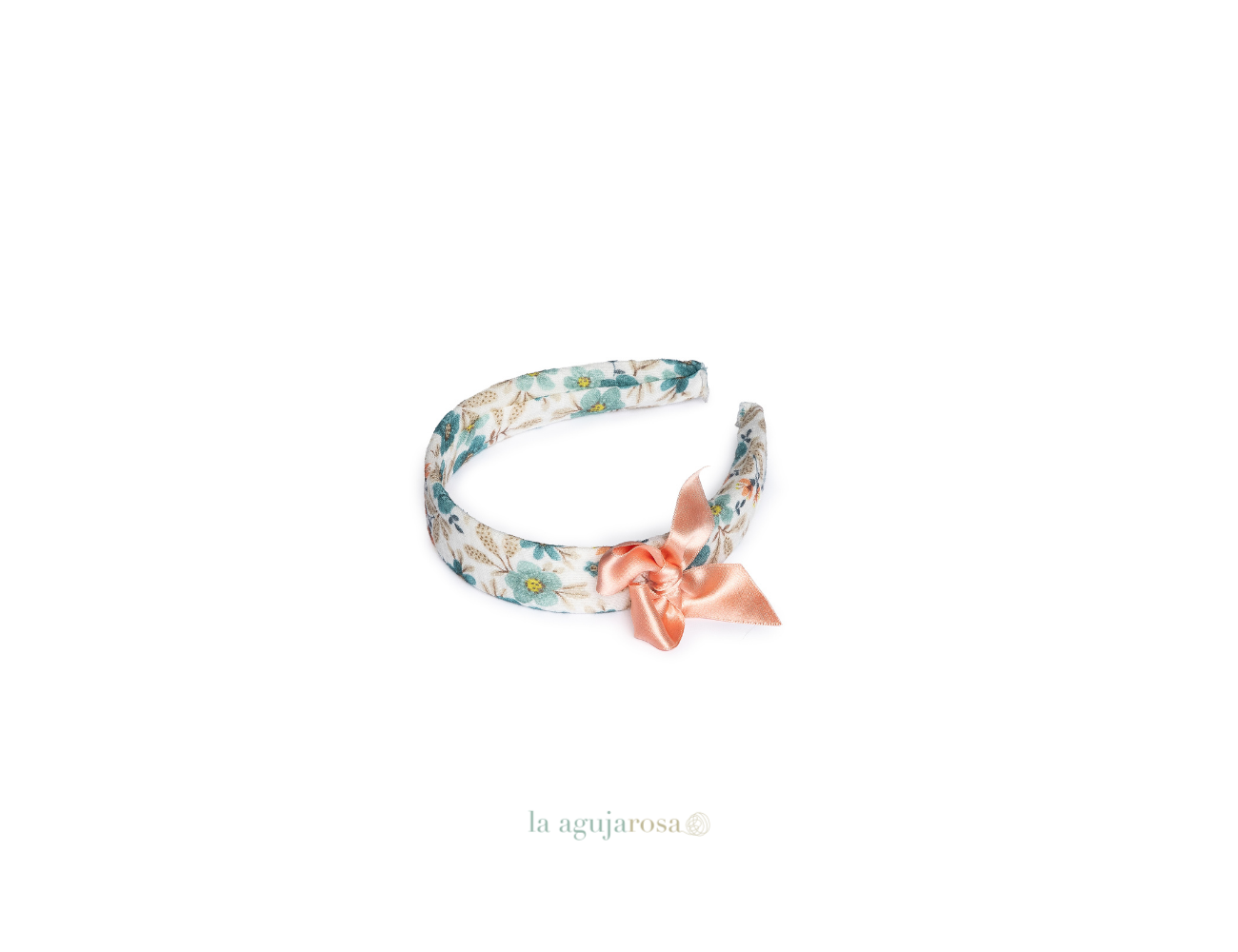 Bonita diadema de tela de tela de flores con lazo de raso de Juliana ideal para complementar con los vestidos y conjuntos de la colección. Confeccionado de forma artesanal con fibras naturales, 100% algodón de tacto fresco, delicado y dulce.