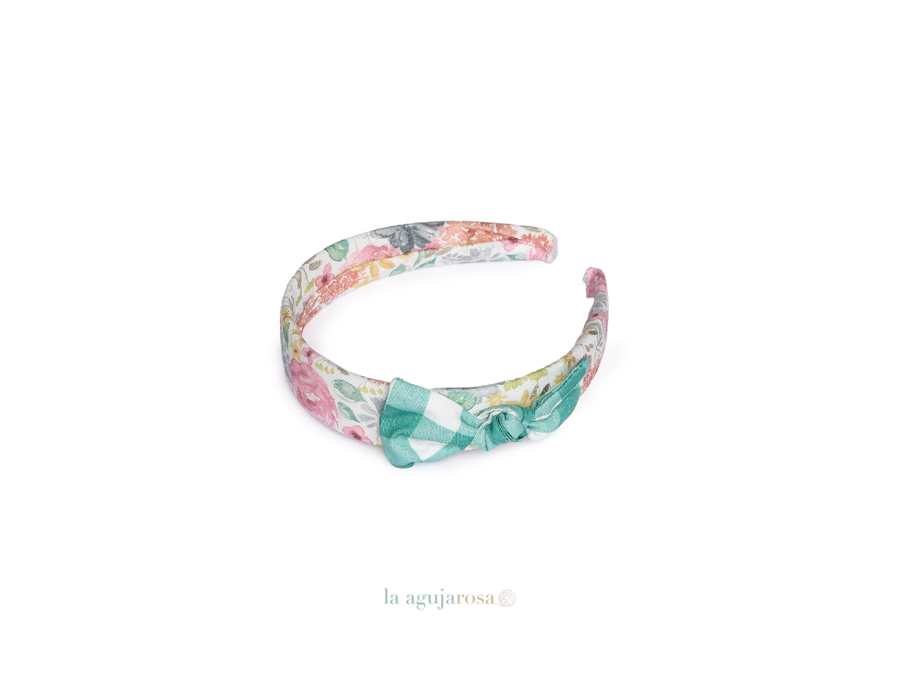 Bonita diadema de tela de flores con lazo de cuadros de Juliana ideal para complementar con los vestidos y conjuntos de la colección. Confeccionado de forma artesanal con fibras naturales, 100% algodón de tacto fresco, delicado y dulce.