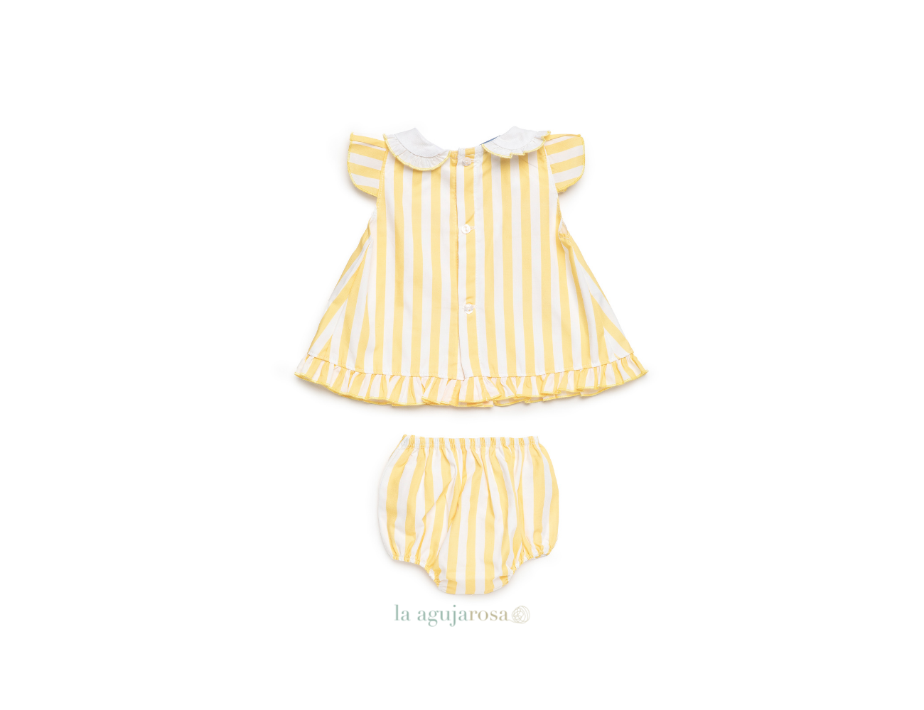 Jesusito con brga en tela rayada de color amarillo de Juliana. Confeccionado de forma artesanal con fibras naturales, 50% acrílico 50% algodón de tacto fresco, delicado y dulce.