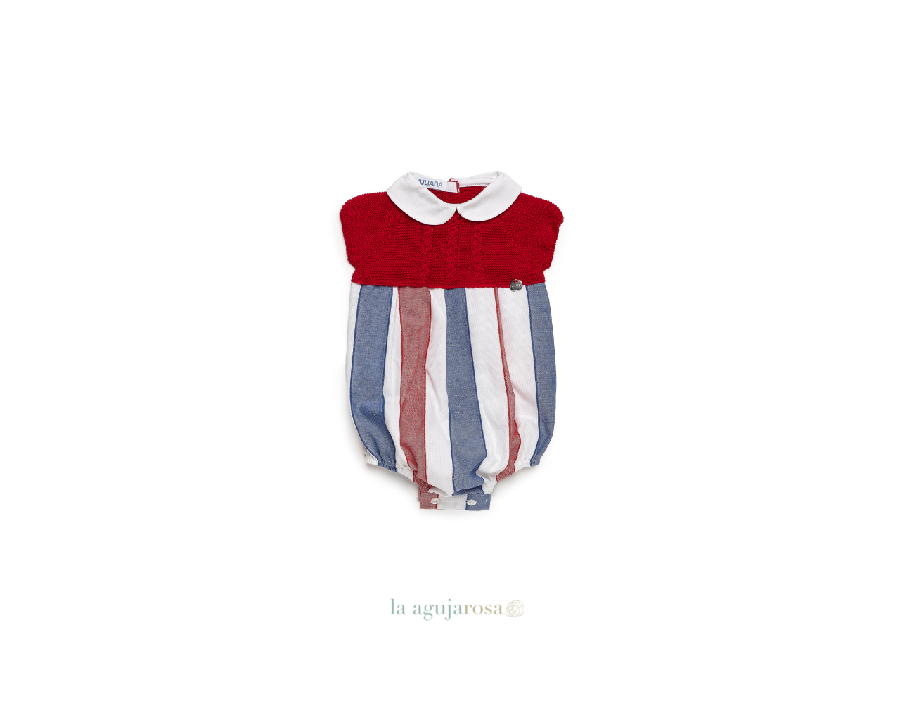 Pelele cuerpo de punto y tela rayada de Juliana. Confeccionado en España con la mejor calidad de forma artesanal con fibras naturales, 100% algodón la tela 50% algodón 50% leacril el punto.