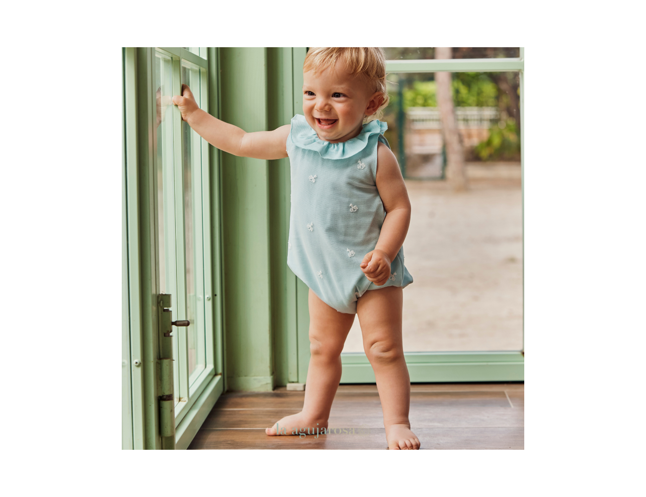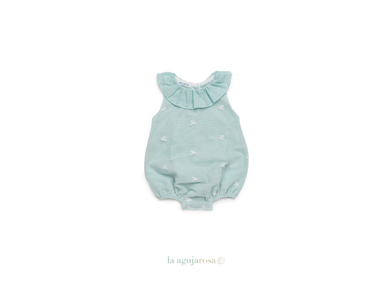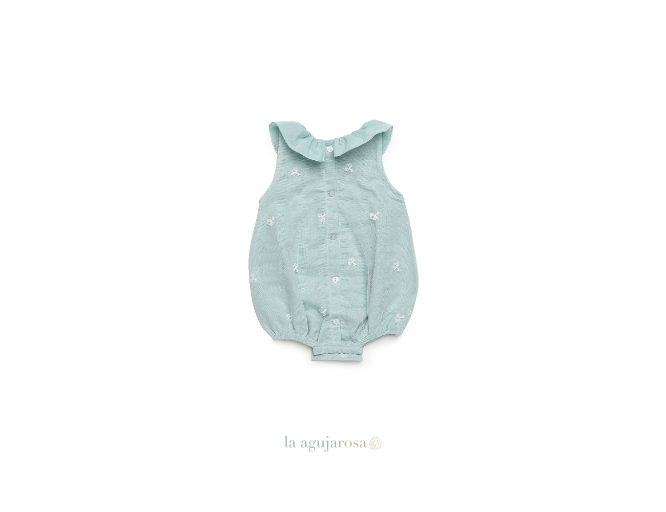 Pelele enterizo de encaje en verde agua de Juliana. Confeccionado en España con la mejor calidad de forma artesanal con fibras naturales, 50% lino 50% algodón.