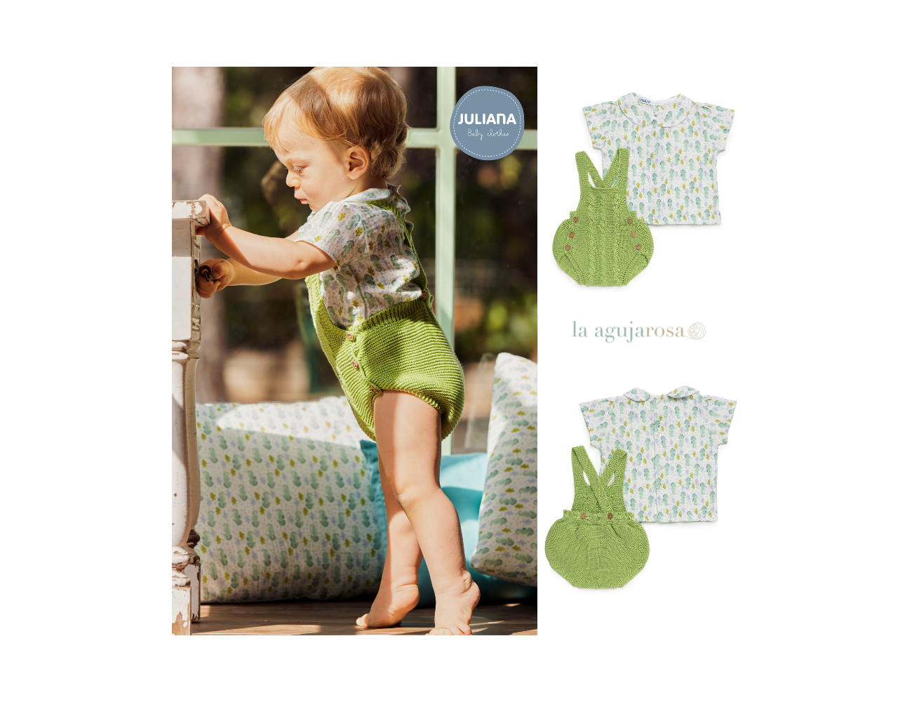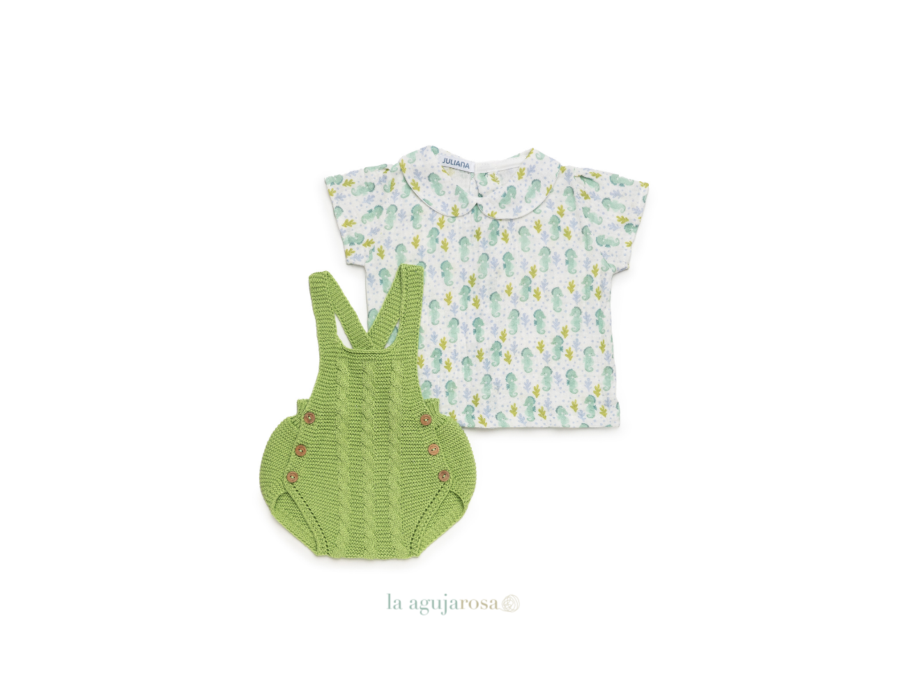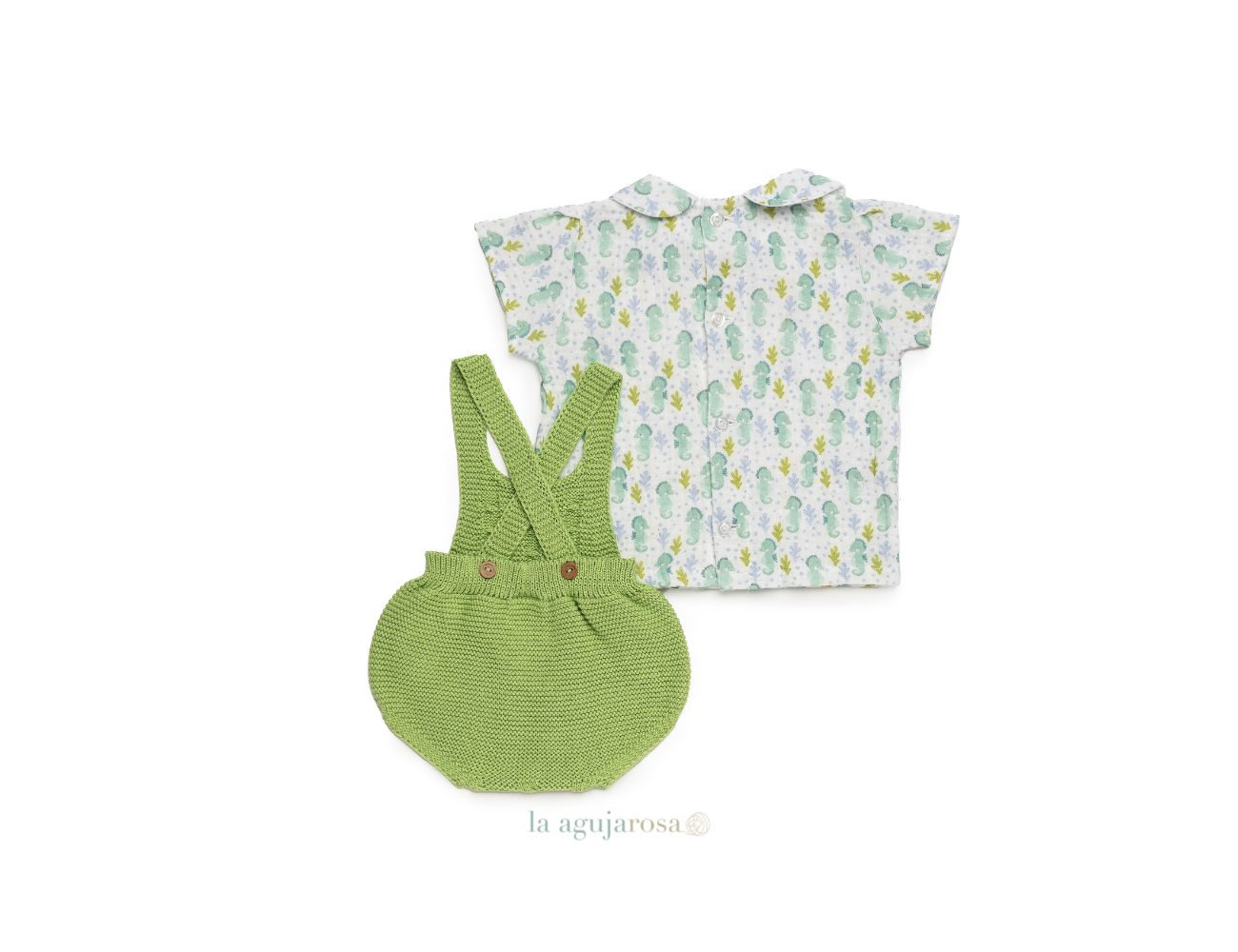 Peto con camisa en tonos lima de Juliana. Confeccionado en España con la mejor calidad de forma artesanal con fibras naturales, 100% algodón la tela 50% algodón 50% leacril el punto.