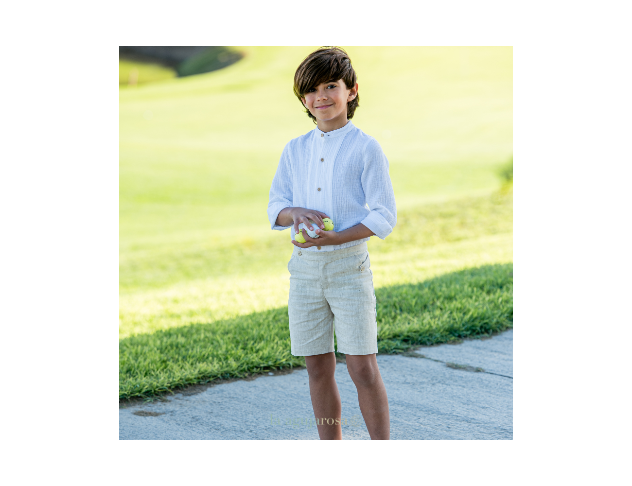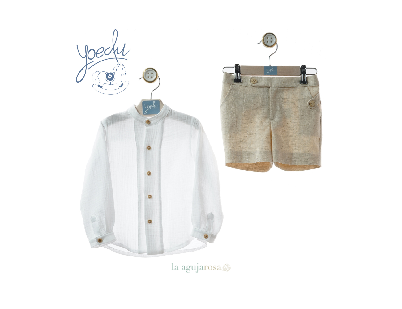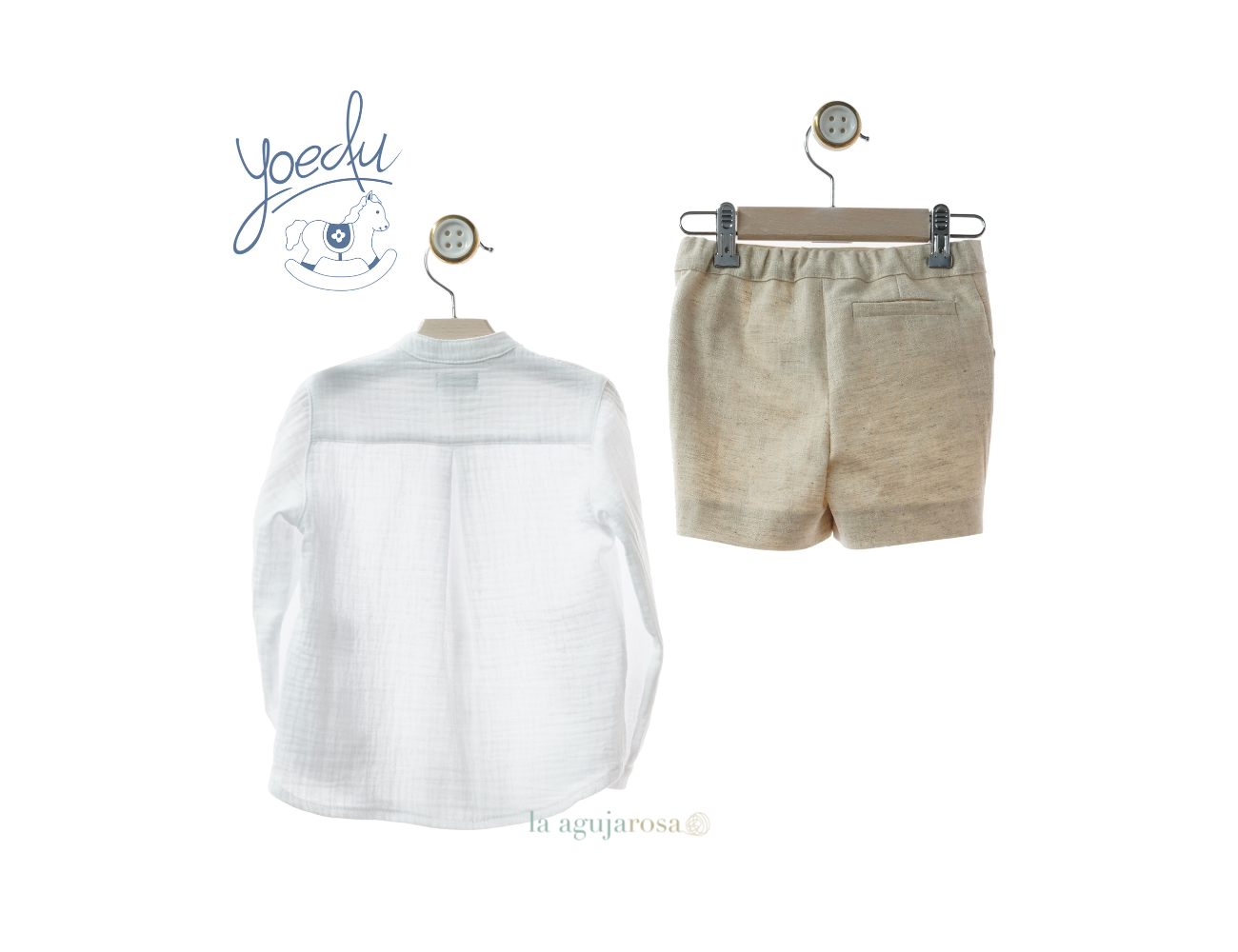 Traje de niño en blanco la camisa y verde hierba el pantalón de Yoedu. Confeccionado en España con la mejor calidad de forma artesanal con fibras naturales, 100% algodón.