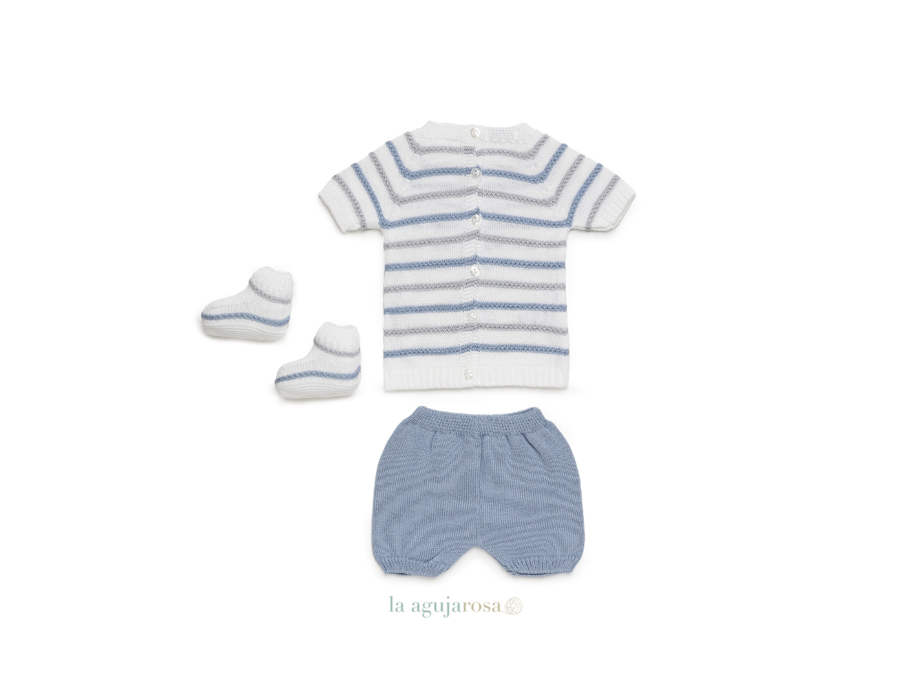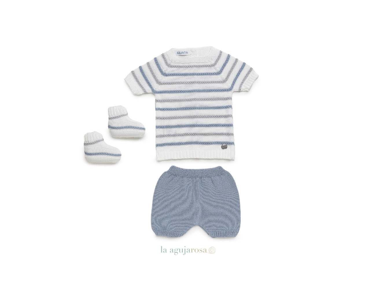 Conjunto de punto pantalón de 3 piezas con lines de colores de Juliana. Confeccionado de forma artesanal con fibras naturales, 50% acrílico 50% algodón de tacto fresco, delicado y dulce.