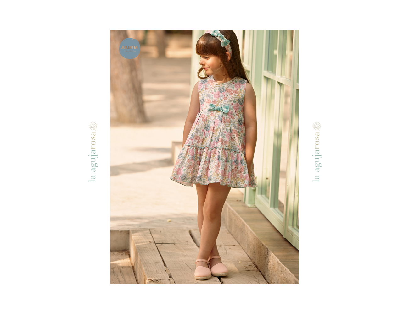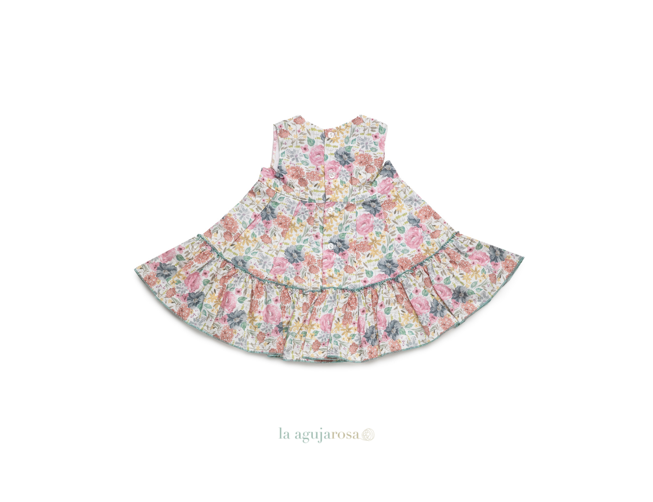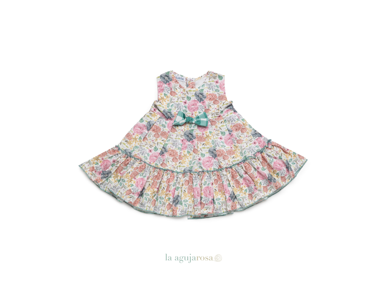 Vestido de niña 2 volantes flores en tones verdes de Juliana. Confeccionado en España con la mejor calidad de forma artesanal con fibras naturales, 100% algodón.