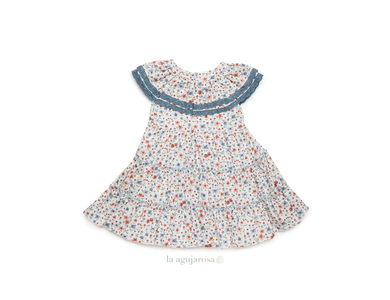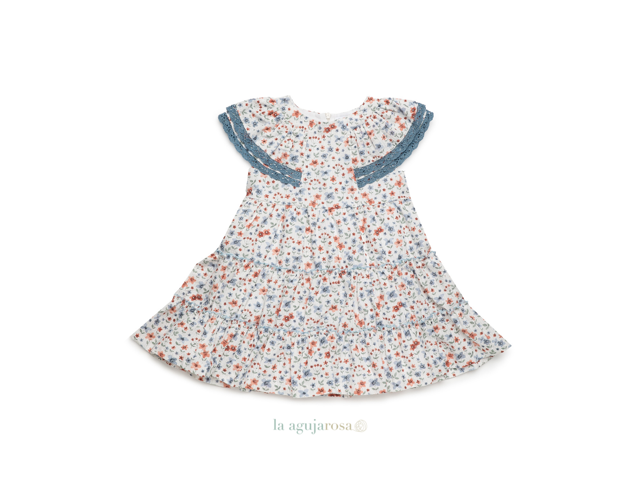 Vestido con cuello volante en tela de flores en tonos azules de Juliana. Confeccionado en España con la mejor calidad de forma artesanal con fibras naturales, 100% algodón.