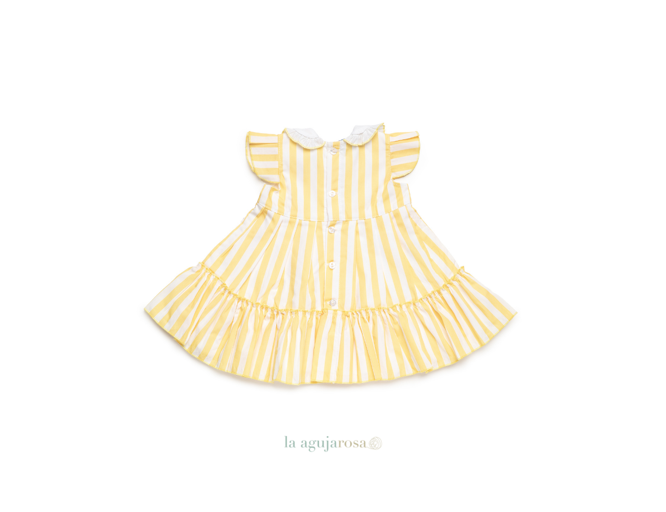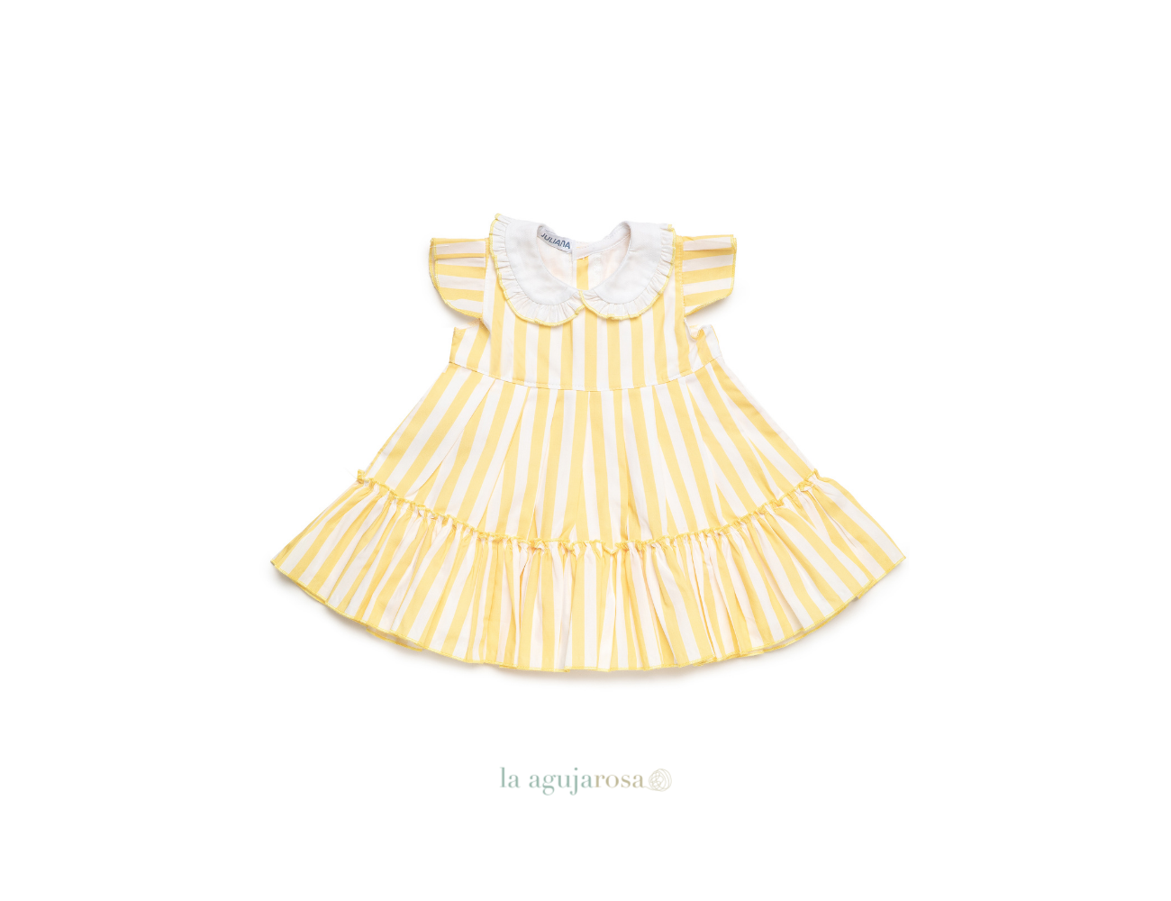 Vestido de niña con 2 volantes en color amarillo de Juliana. Confeccionado de forma artesanal con fibras naturales, 50% acrílico 50% algodón de tacto fresco, delicado y dulce.