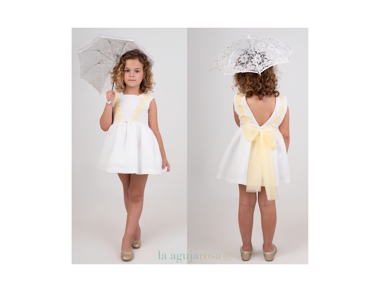 VESTIDO CEREMONIA BLANCO CON PASACINTAS EN AMARILLO DE NEKENIA