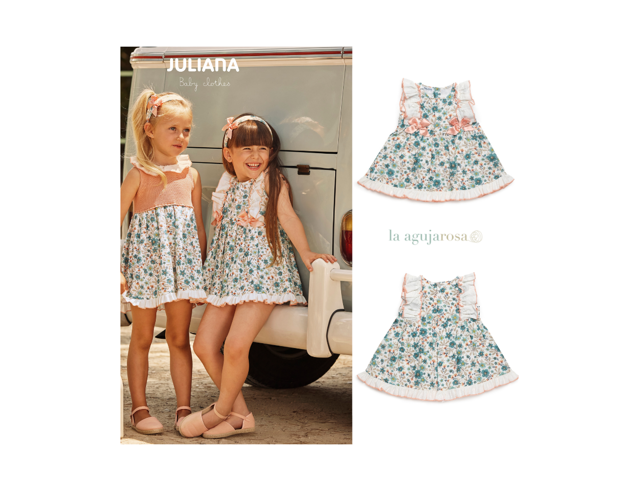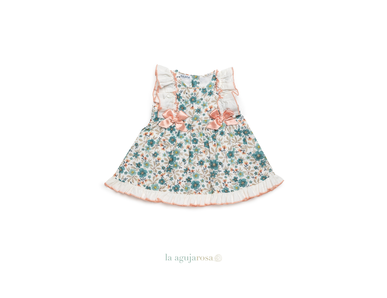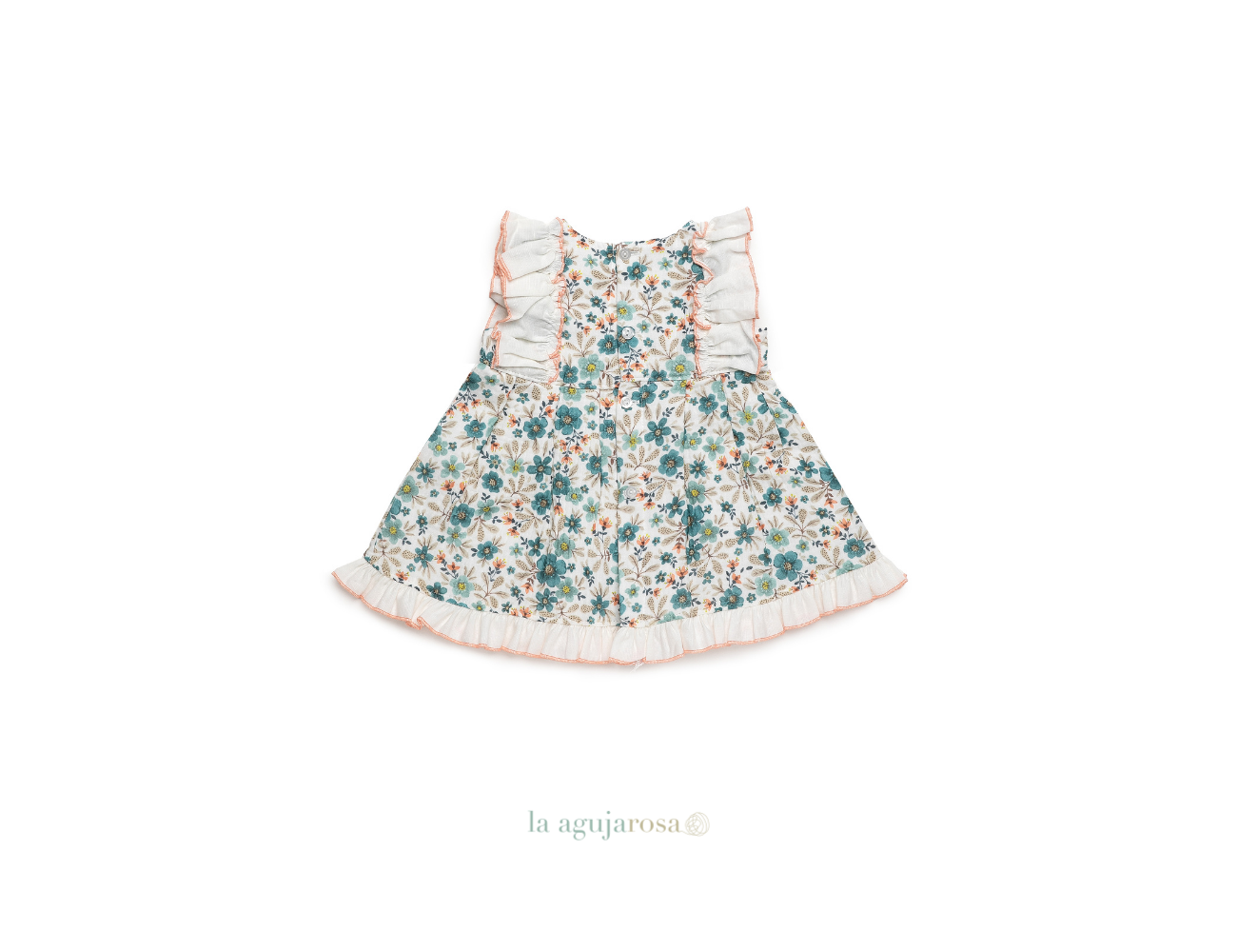 Vestido cortado a la cintura con volantes de flores de Juliana. Confeccionado en España con la mejor calidad de forma artesanal con fibras naturales, 100% algodón.