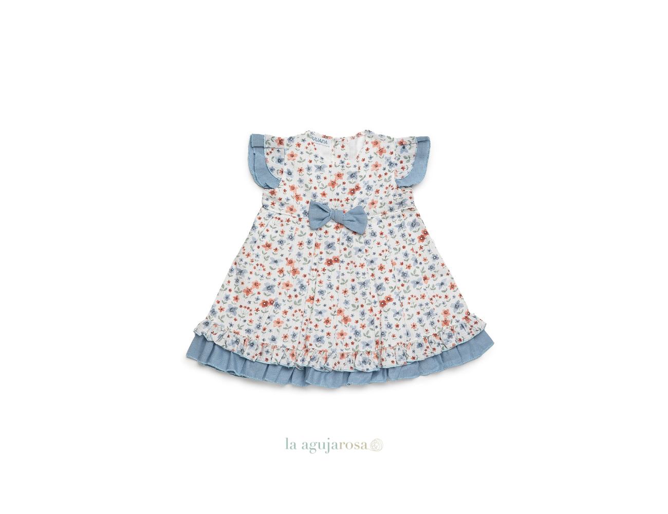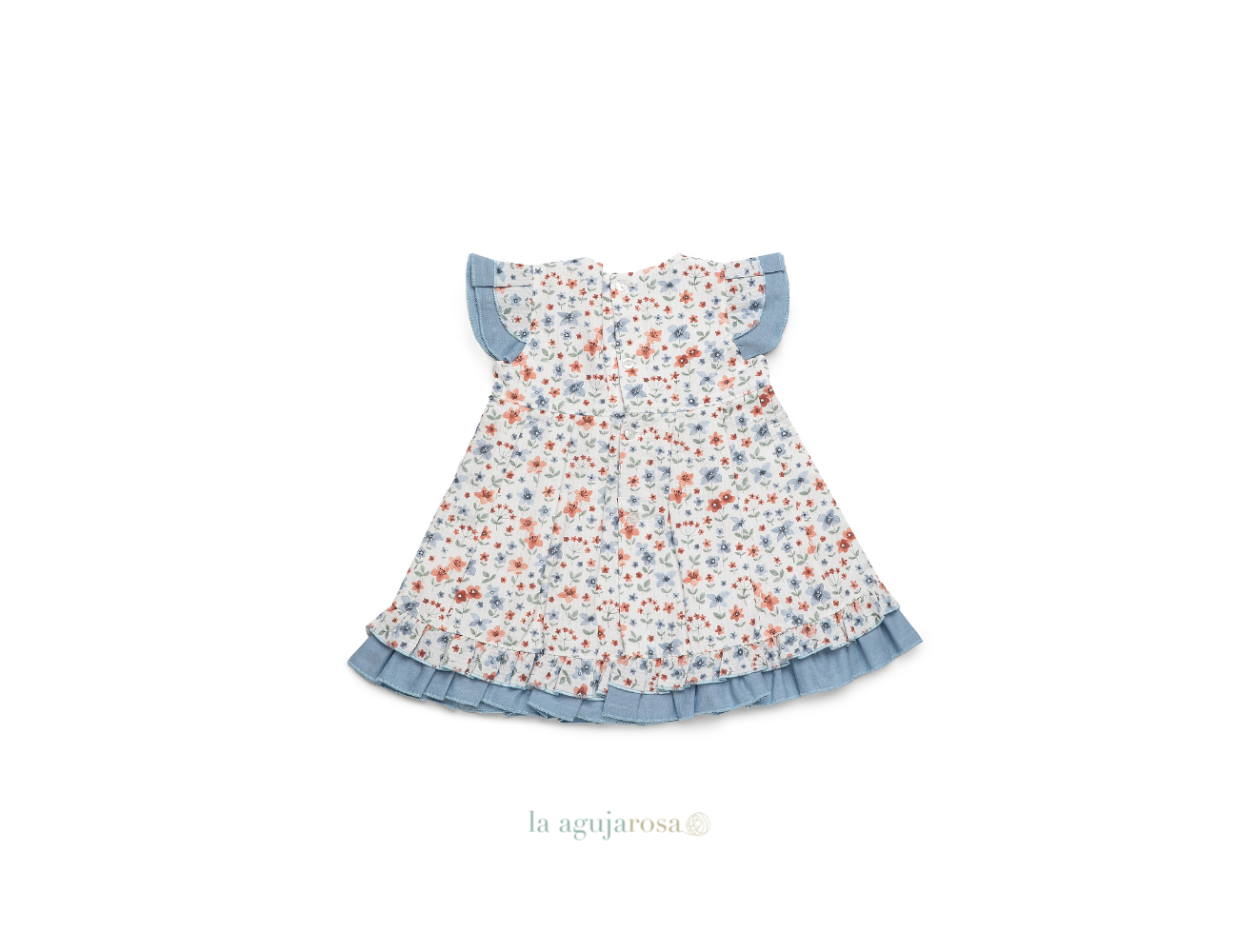 Vestido cortado a la cintura de tela de flores en tonos azules de Juliana. Confeccionado en España con la mejor calidad de forma artesanal con fibras naturales, 100% algodón.
