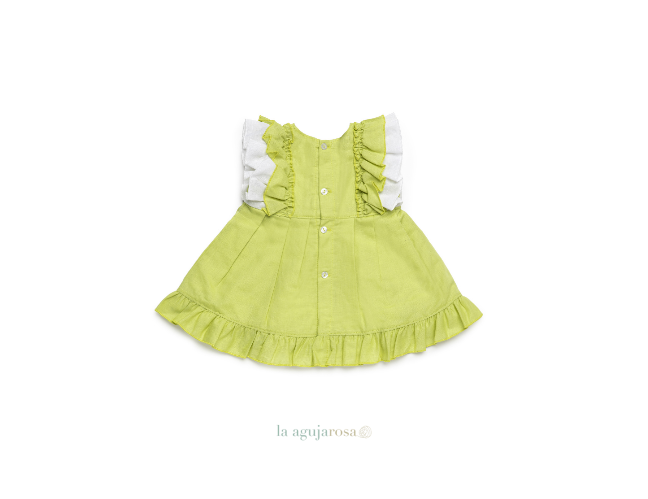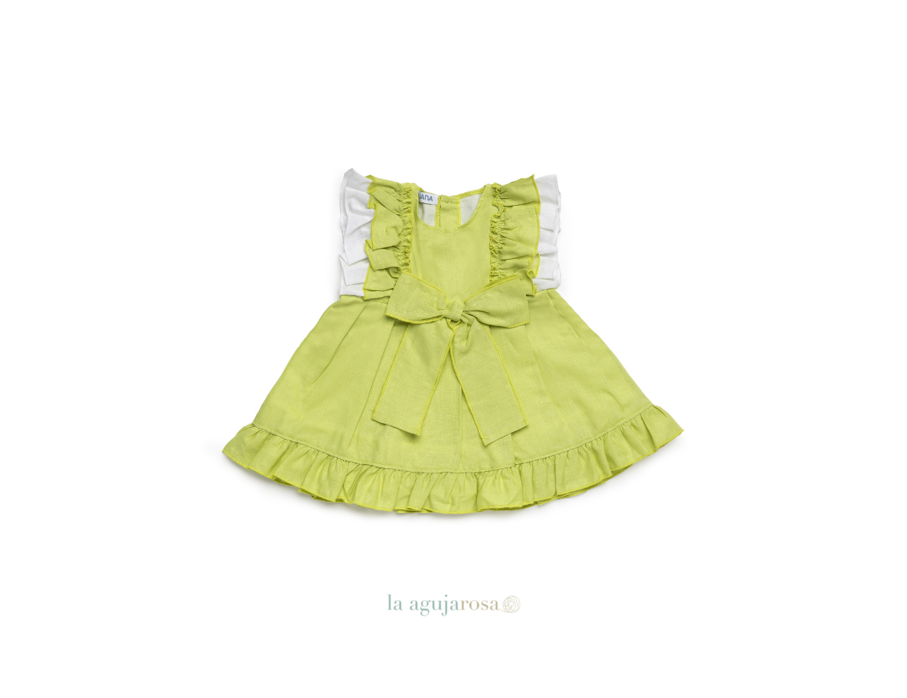 Vestido cortado a la cintura en tonos lima de Juliana. Confeccionado en España con la mejor calidad de forma artesanal con fibras naturales, 50% lino 50% algodón.