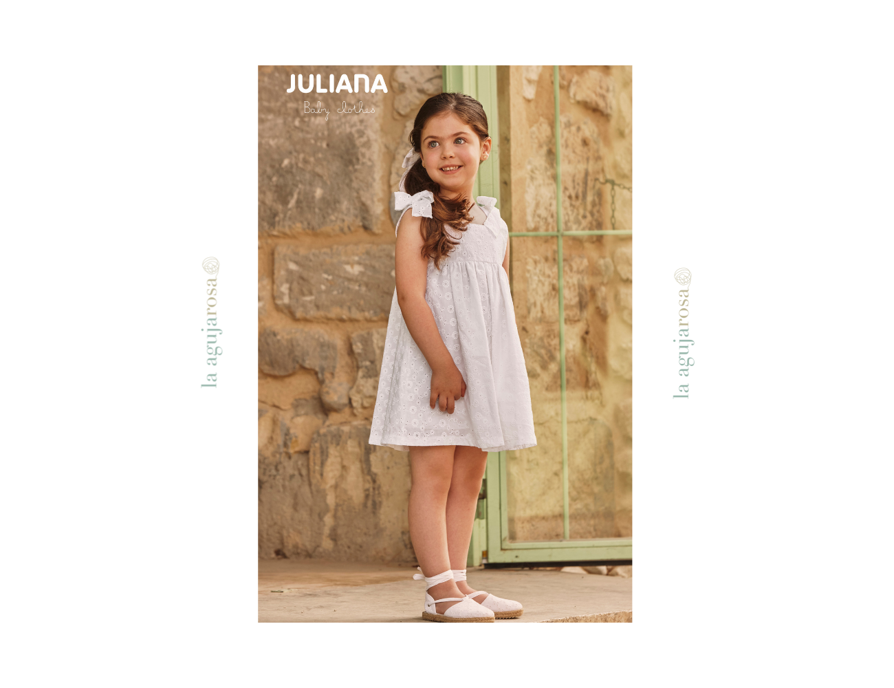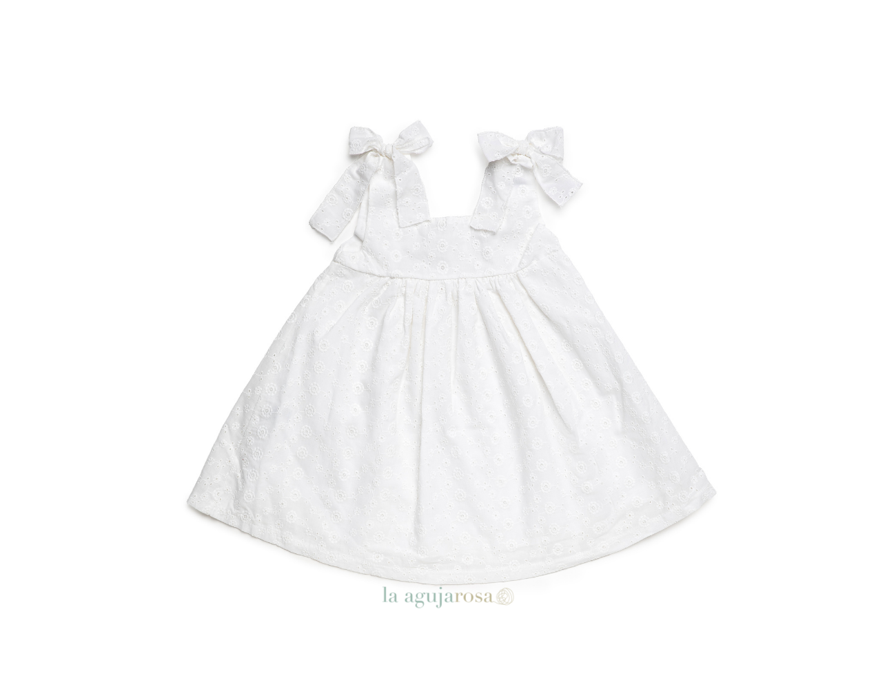 Vestido de niña cortado a la cintura de encaje en color blanco de Juliana. Confeccionado en España con la mejor calidad de forma artesanal con fibras naturales, 100% algodón.