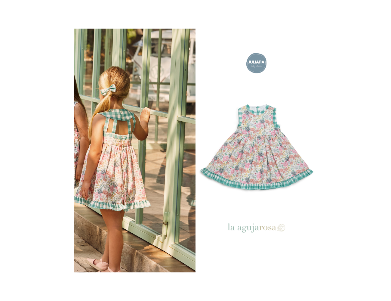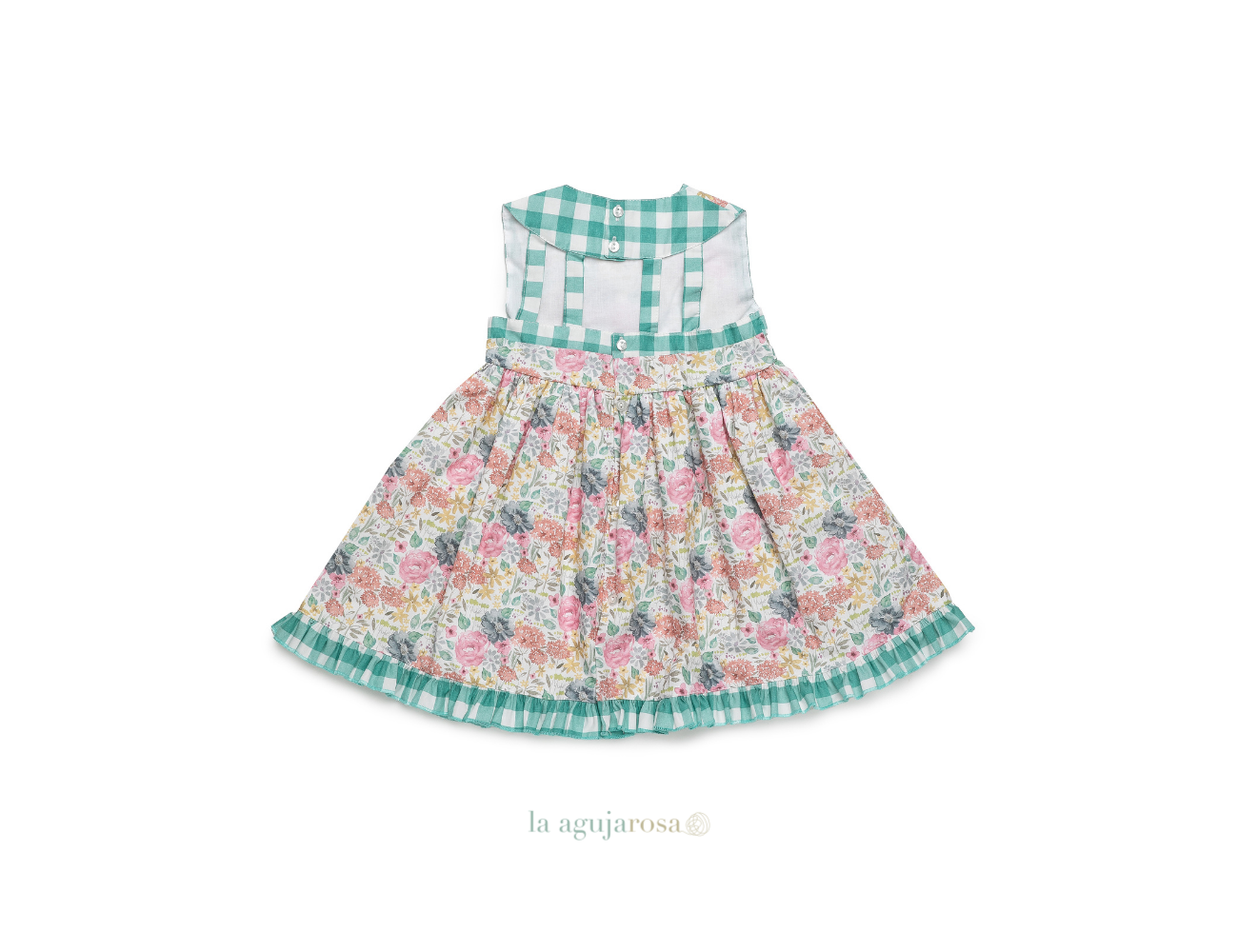 Vestido de niña cortado cintura de flores y cuadros de Juliana. Confeccionado en España con la mejor calidad de forma artesanal con fibras naturales, 100% algodón.