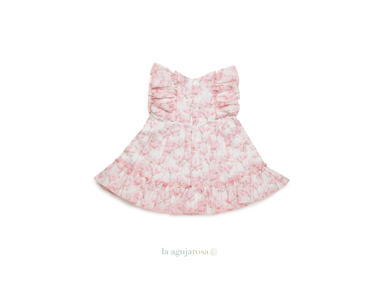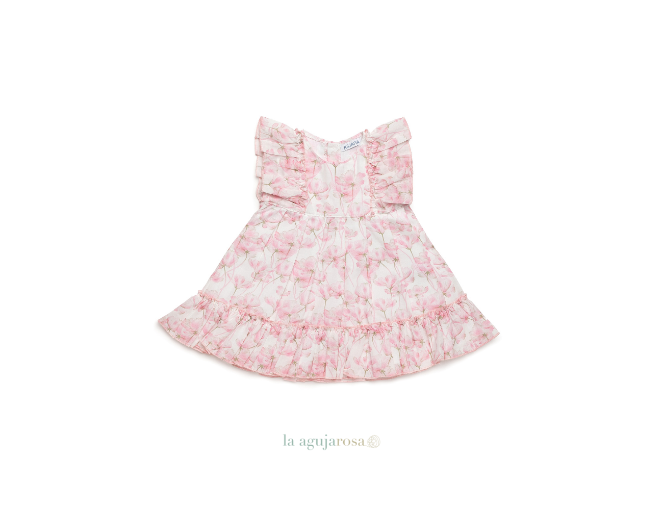 Vestido cortado cintura flores de niña en tonos rosas de Juliana. Confeccionado en España con la mejor calidad de forma artesanal con fibras naturales, 100% algodón.