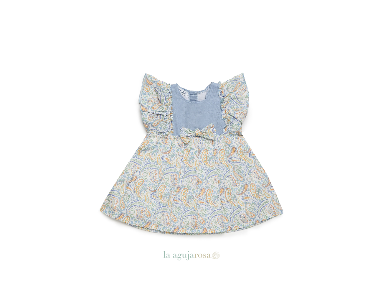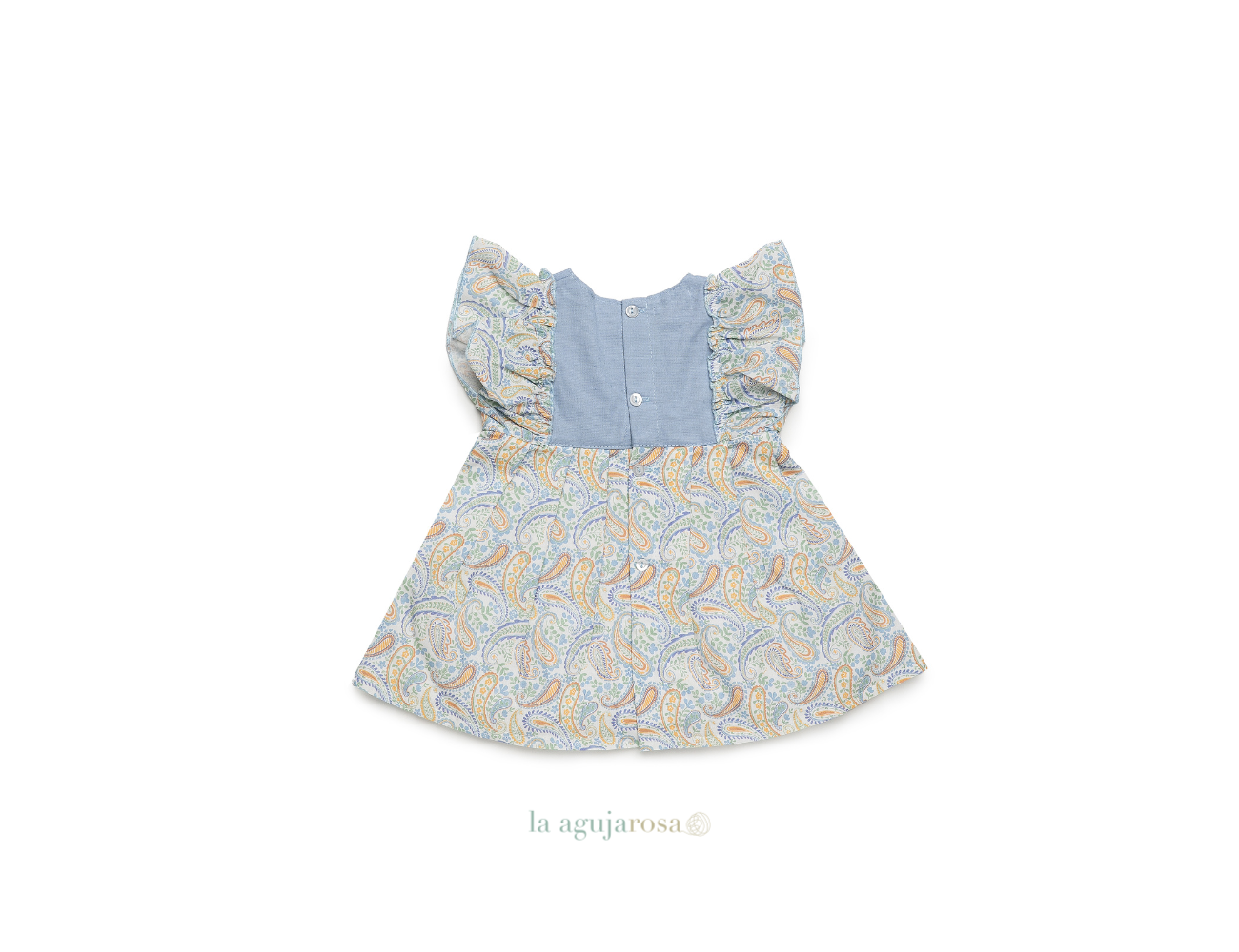 Vestido cortado a la cintura en tonos azules tela de cachemira de Juliana. Confeccionado en España con la mejor calidad de forma artesanal con fibras naturales, 100% algodón.