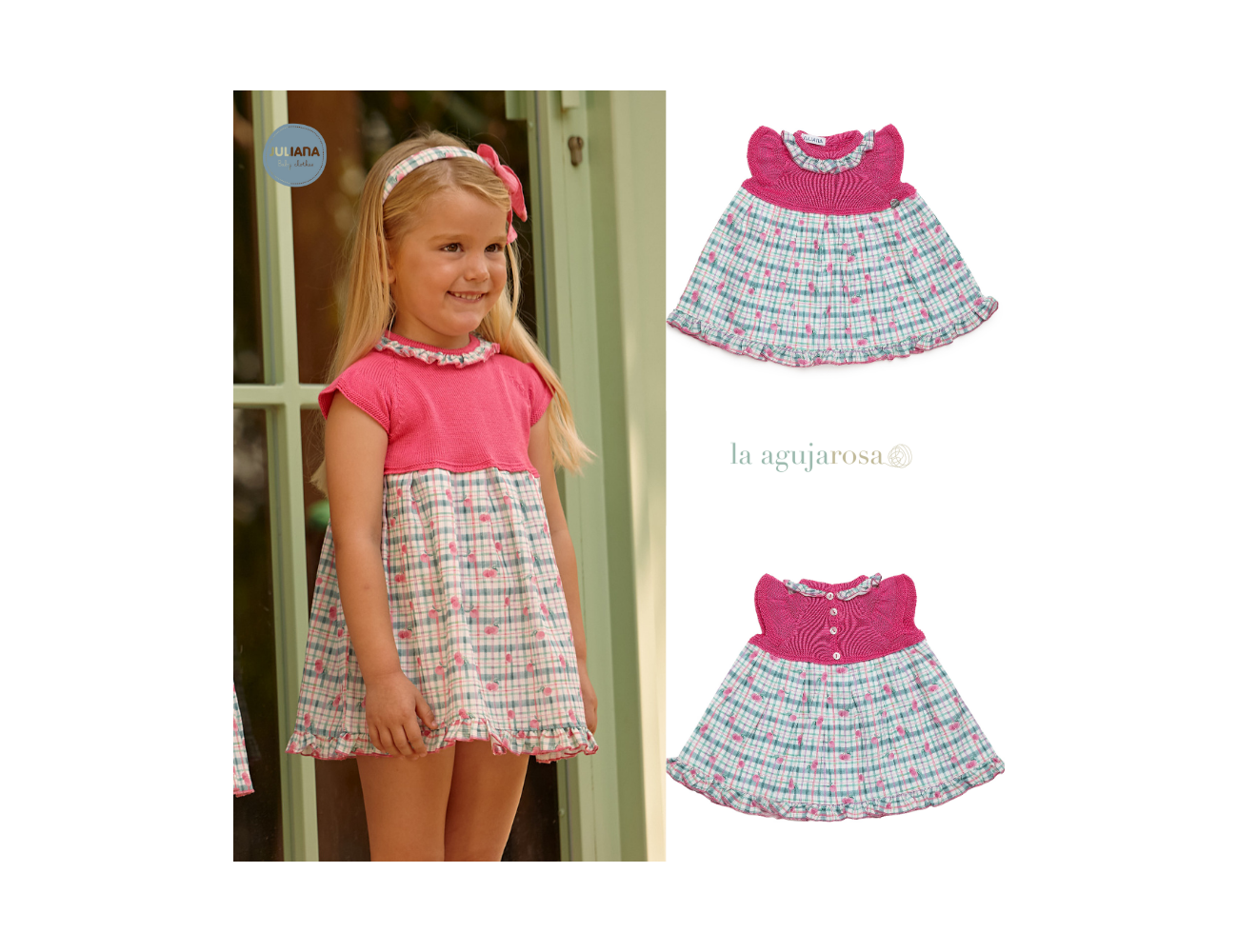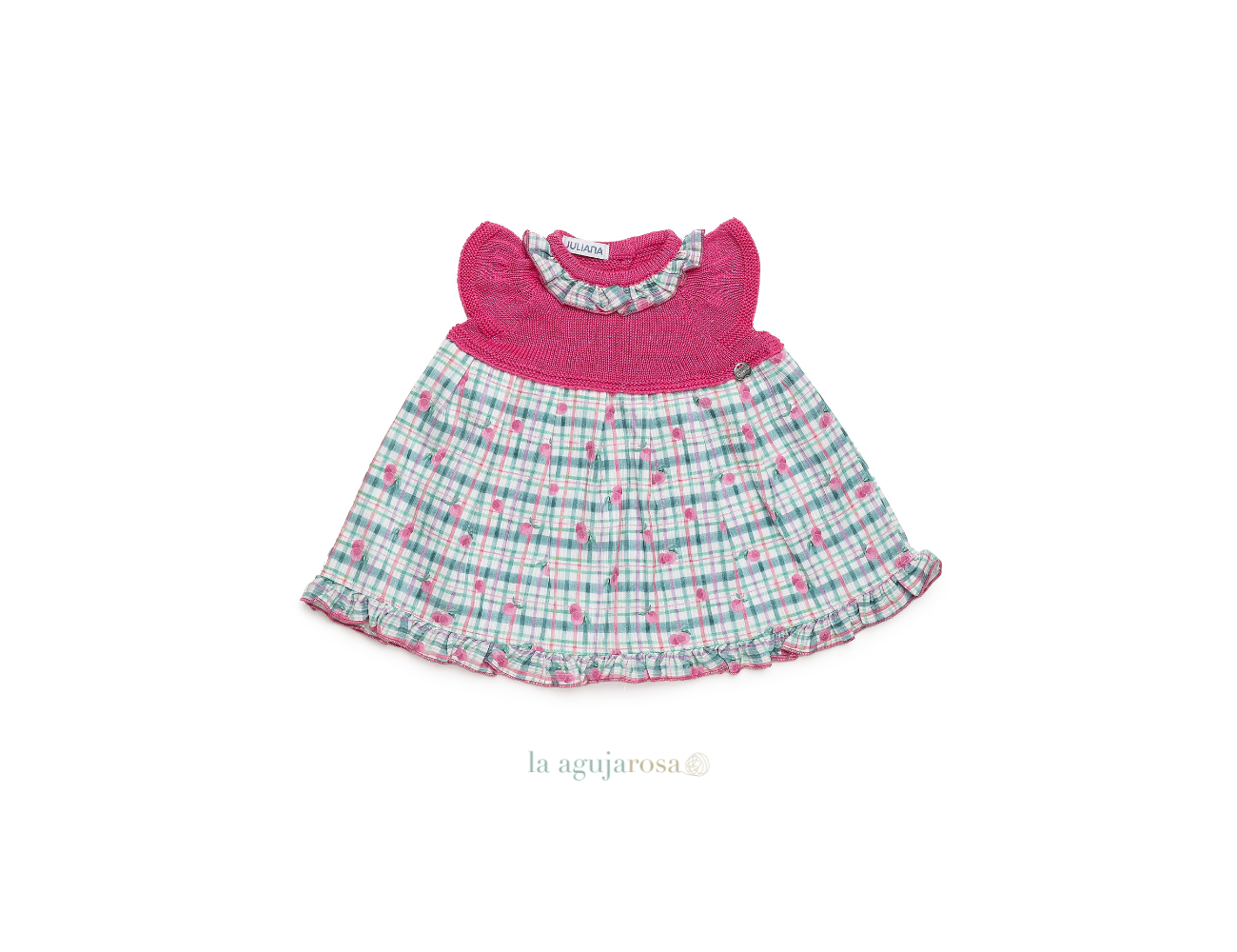 Vestido con cuerpo de punto y tela de cuadros en tonos fresa de Juliana. Confeccionado en España con la mejor calidad de forma artesanal con fibras naturales, 100% algodón la tela 50% algodón 50% leacril el punto.