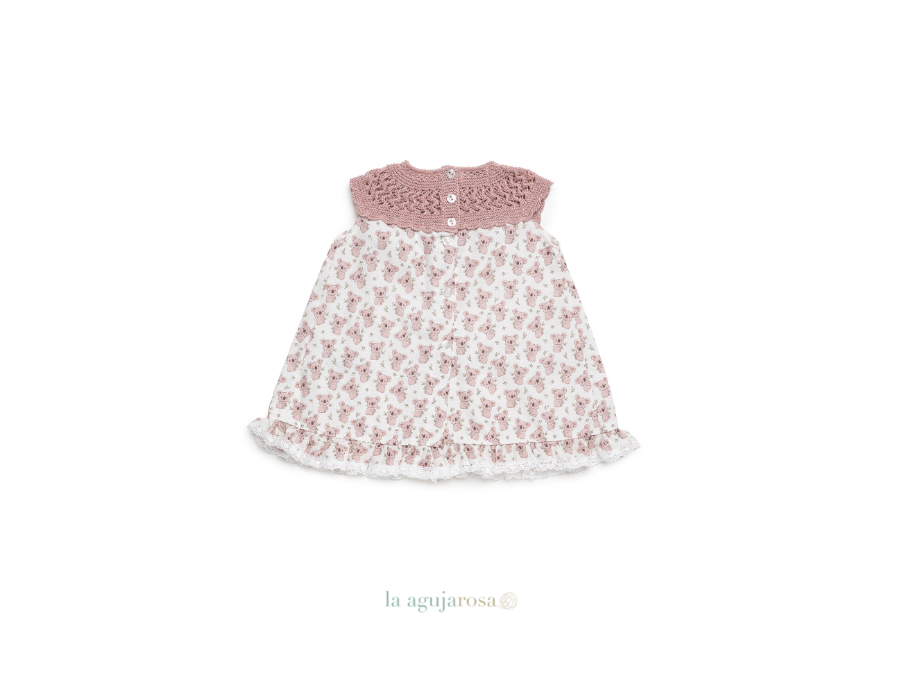 Vestido cuerpo de punto tela koalas en rosa maquillaje con beige de Juliana. Confeccionado de forma artesanal con fibras naturales, 50% acrílico 50% algodón el punto y 100% algodón la tela de tacto fresco, delicado y dulce.