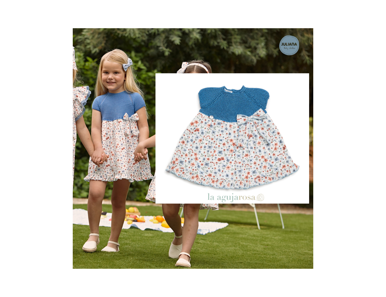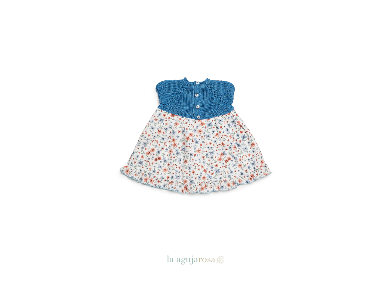 Vestido con cuerpo de punto y tela de flores en tonos azules de Juliana. Confeccionado en España con la mejor calidad de forma artesanal con fibras naturales, 100% algodón la tela 50% algodón 50% leacril el punto.