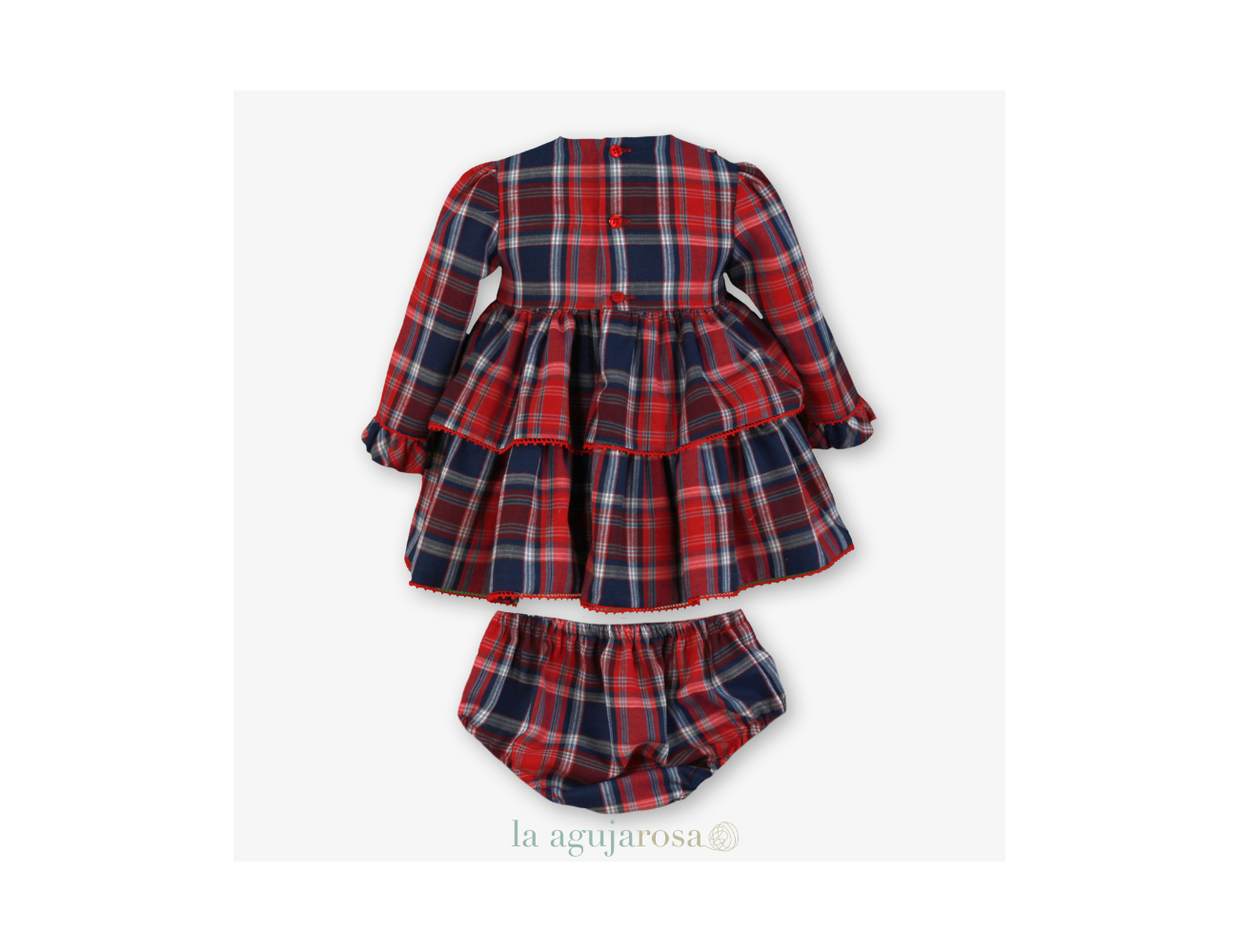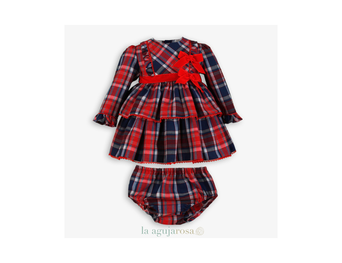 Maravilloso vestido de manga larga con braguita de la marca Miranda. Esta confeccionado en tejido estampado de cuadro escoces rojo y azul. Es de corte en la cintura con falda voluminosa de 2 volantes ribeteados con pequeñas borlas rojas. Luce drapeado en el corte, asi como tira de terciopelo rojo en la cintura y 2 grandes lazadas de terciopelo rojo en el delantero. Cierra en la espalda.